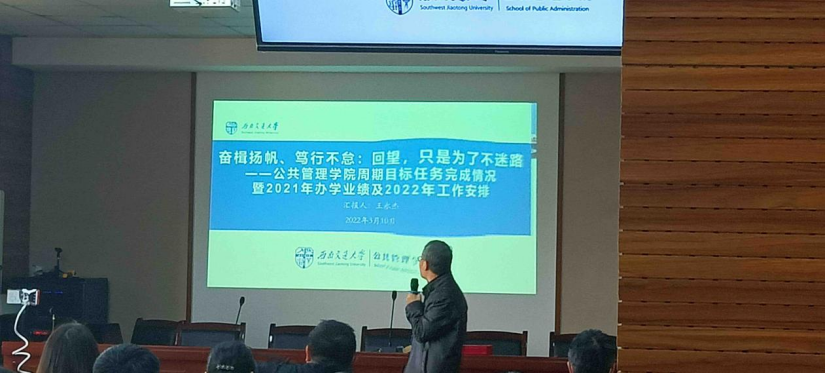 会议伊始,院长王永杰陈述了2021年的年度工作报告,根据实际情况从学生就业数据、博士点申请、院内资源整合以及国际化等方面对学院各项工作展开分析,并提出相关指导意见。会上,王院长还总结了学院在2021年度所取得的各项成绩,并对优秀教职工给予表彰。王院长铿锵有力的话语凝聚起全体教职工对学院美好未来的信心,“班子和谐,党政同心才是取得良好工作的根本保证。”育人路初心如磐,还望新征程再谱新篇。