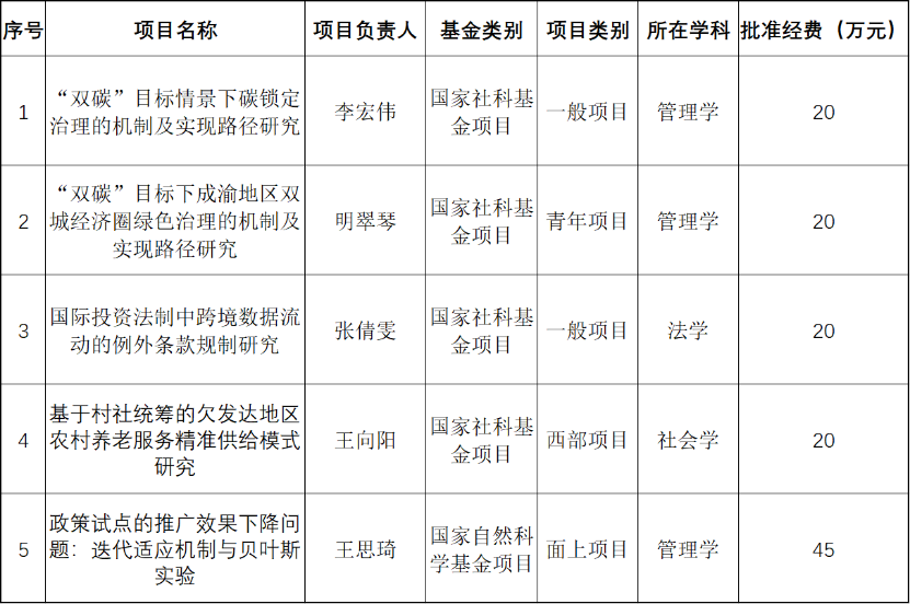 喜获5项国家基金项目立项,国家社科基金4项,其中一般项目2项,青年项目1项,西部项目1项;国家自然科学基金项目1项。
