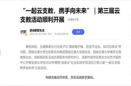 第三届云支教志愿服务活动,356名志愿者对接成都数十所中小学,覆盖中小学生400余名,发起云支教公益课堂直播,直播人数超过2000人。