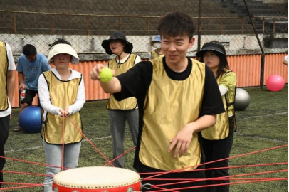 红线连鼓,欢欣鼓舞。一双双手握紧手中的绳子,确保每次使出的力度基本相等,节奏达到高度统一。选手们全神贯注,随着球落下的方向迅速移动,将球一次又一次地颠向空中。一声声球击打鼓面的声响,是他们默契配合的证明。