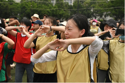 摩拳擦掌,蓄势待发。“动动手,弯弯腰,一起来跳健身操”。随着音乐响起,全体同学跟随教练的“舞姿”在运动场上活动筋骨、舒展身躯。参赛选手们情绪高昂、跃跃欲试,脸上洋溢着灿烂笑容。谈笑风生间,一股浓烈的“火药味儿”在赛场上弥漫开来。