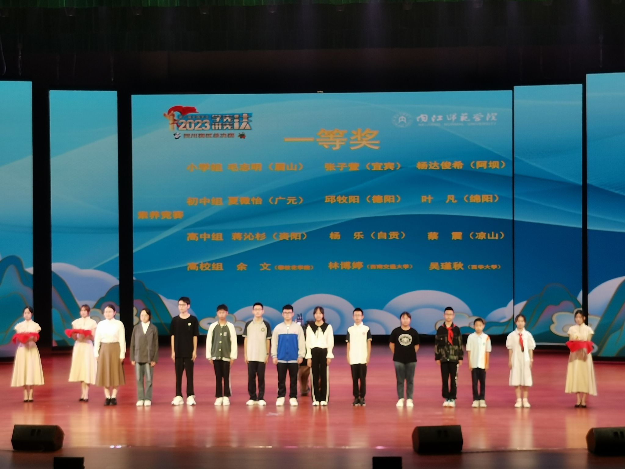本次大赛由四川省教育厅主办,包含素养竞赛和演讲比赛两项赛事,分为片区赛和省级决赛,吸引了众多来自不同高校杰出选手参赛。每项赛事按学龄段共设小学、初中、高中和高校四个组别,内容主要聚焦宪法,包含民法典、国家安全法、未成年人保护法、职业教育法等相关法治知识。
