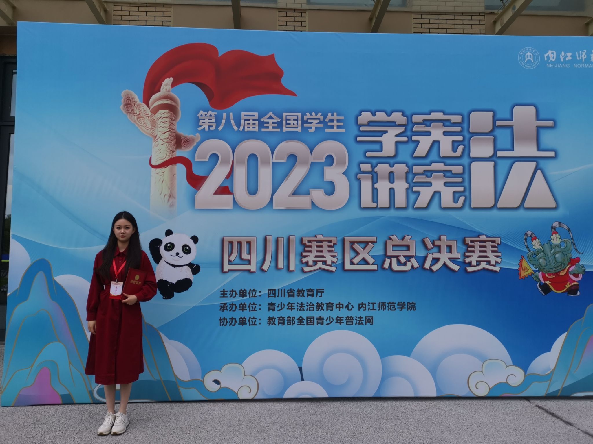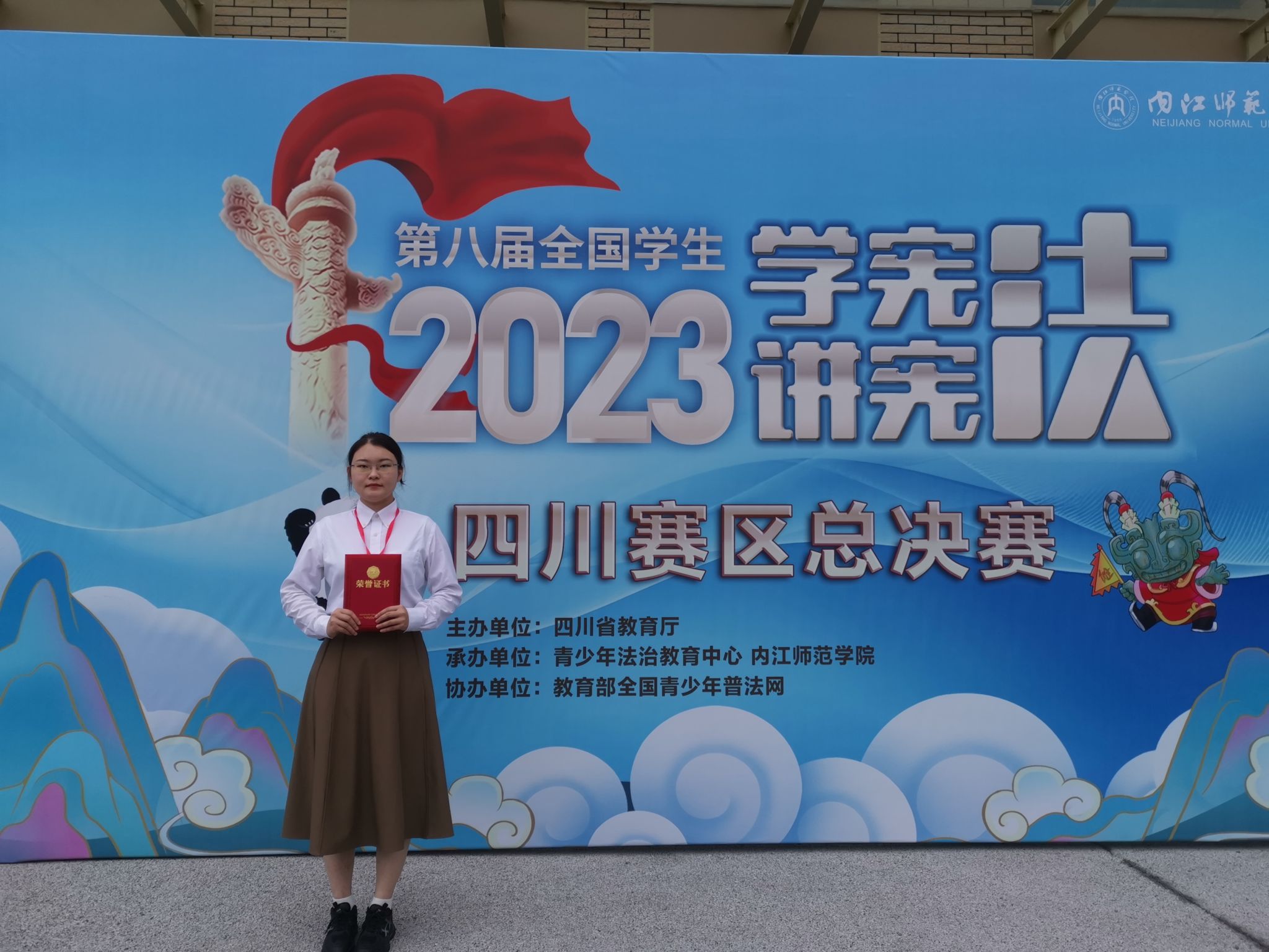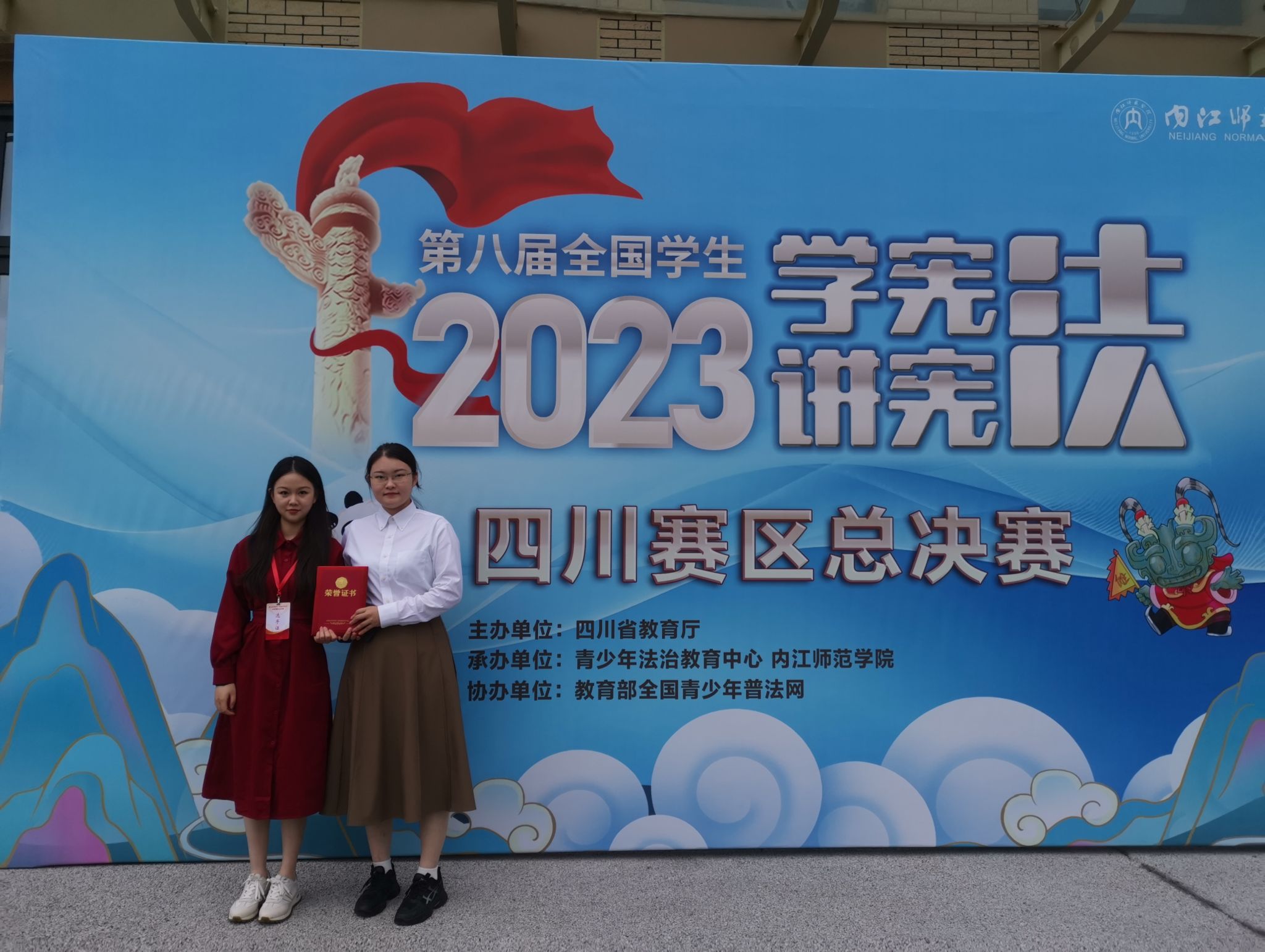 法学系张晶老师指导的本科生林博婷、费佳瑶同学在举办于内江市内江师范学院的四川省总决赛中分别取得素养竞赛一等奖和演讲比赛三等奖的优异成绩。