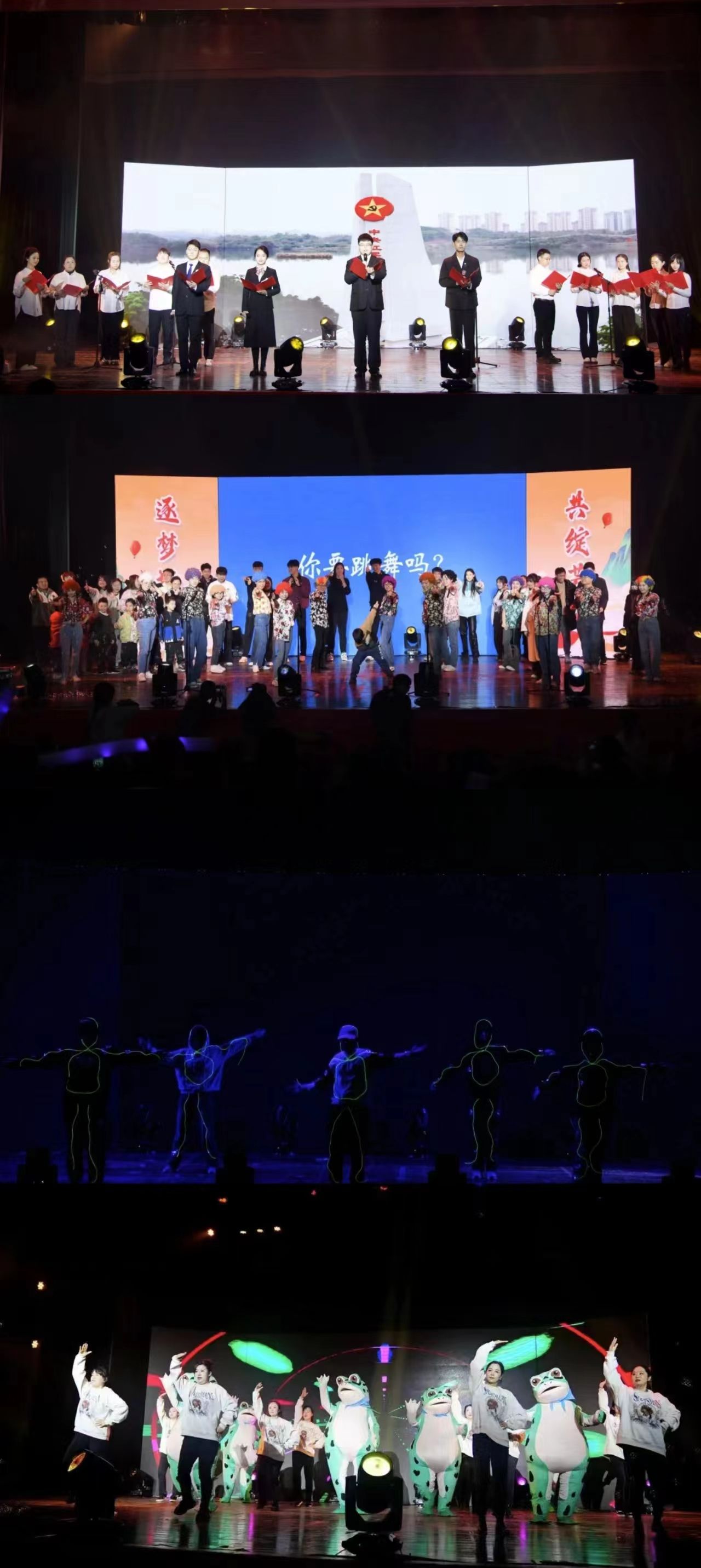 击鼓催征稳驭舟,奋楫扬帆启新程。我辈少年郎,晔晔如扶桑。“你说头悬梁锥刺股,我说小信诚则大信立……”《老妈说话不算话》,管小苗们稚嫩的童声让观众仿佛回到了童年;时光岁月如歌,《光阴的故事》里每个人都在闪闪发光;老龄研究中心大声唱出《你要跳舞吗》,用年轻的节拍诠释澎湃的活力,高凡书记也来到舞台上同大家一起“摇摆”;《小苹果》里公管系的老师们种下希望、渴望收获……我们向往诗和远方,用脚步丈量脚下的祖国山川。《祖国啊,我亲爱的祖国》,拥有独具魅力的风景和独特的文化底蕴,九州一色显巍巍山河。跨江河,听山歌,看白云,让我们在优美的舞蹈中体验《浪拉山情》……