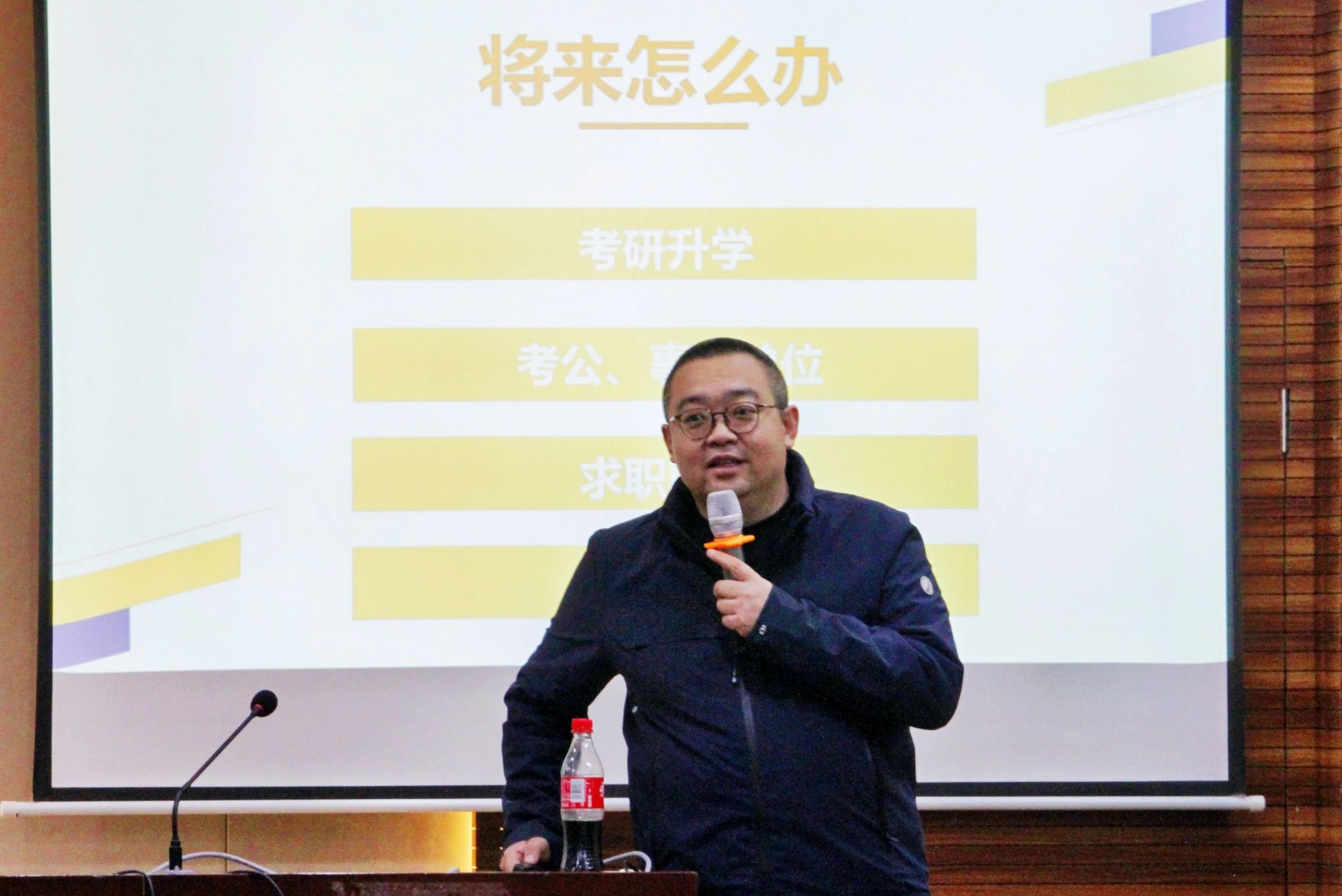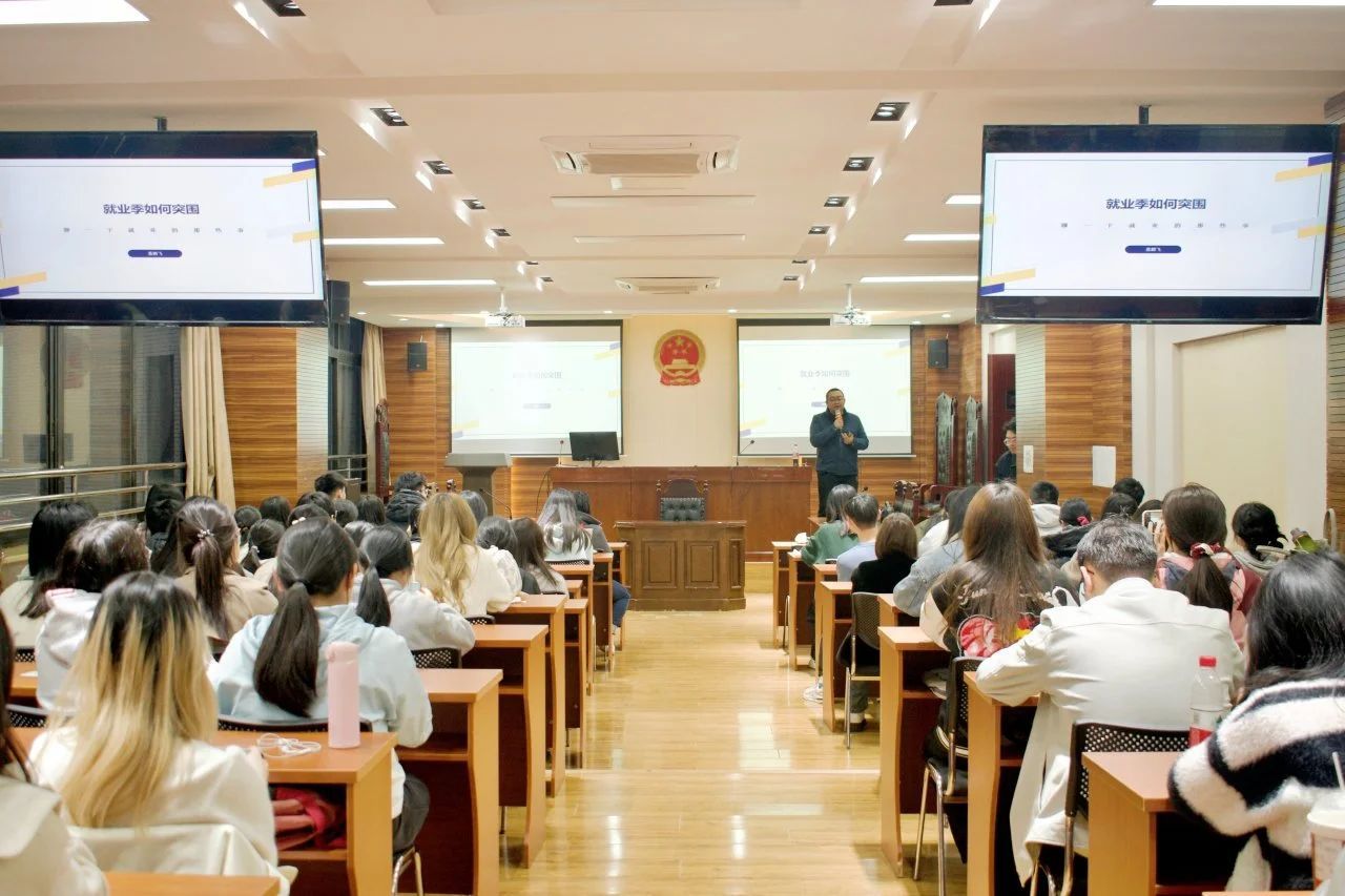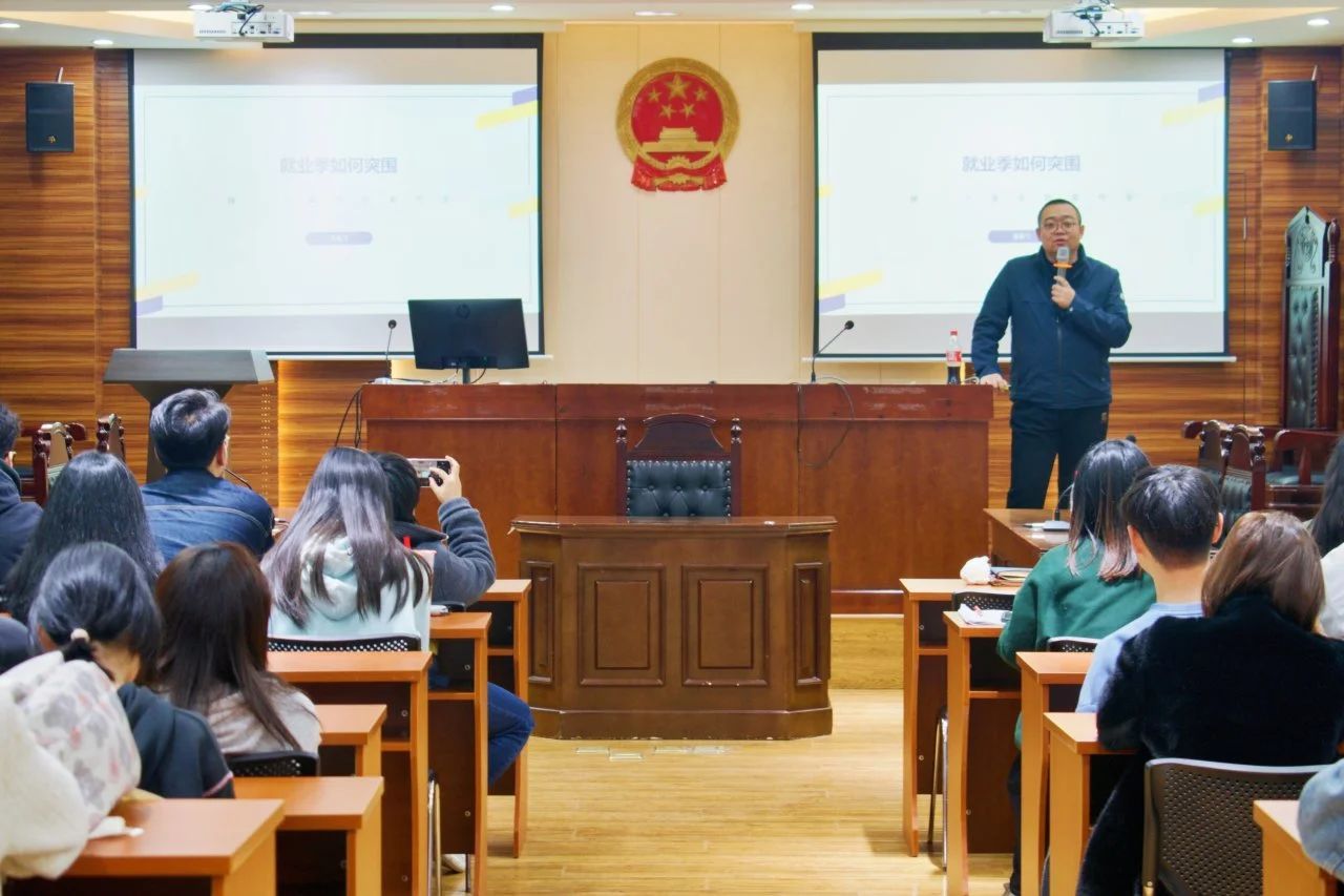 邀请到学校就业处对外联络科科长董鹏飞老师进行专题讲座,为大家分享春招就业形势和求职经验。就业处对外联络科副科长郑敏老师也来到现场,与在场100余名公管学子共同倾听董老师的讲解。