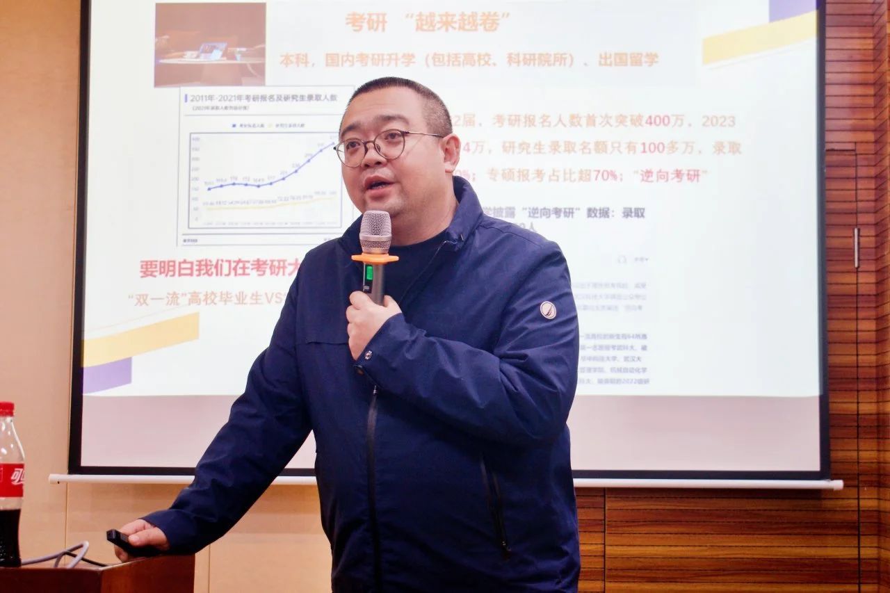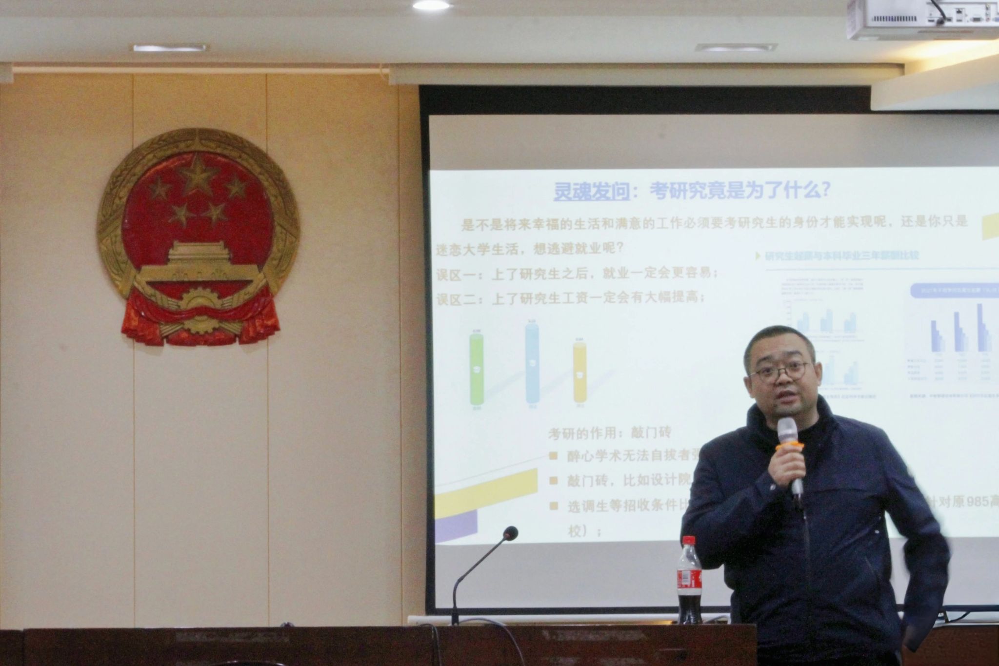 2024年3月18日晚上,讲座在九里校区零号教学楼1417会议室开始。董老师以问题开场,他接连抛出一连串的问题:“大家将来到底怎么办?”“是考研升学,还是考公考编?是就业求职,还是躺平养老呢?”对于想要考研的同学,董老师通过分析近年来考研的趋势,提到考研是一个敲门砖的作用,指出大家要避免进入读研后就业更容易,工资更高的误区。“战胜内卷是成功上岸的秘诀”——董老师如此寄语决心考研的同学,送上了美好的祝福。