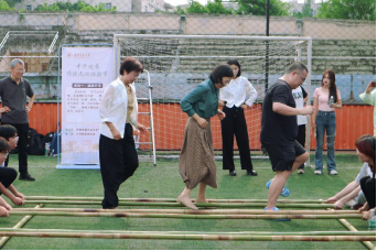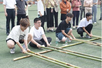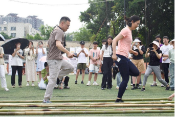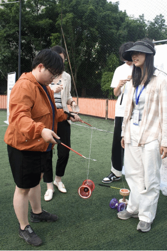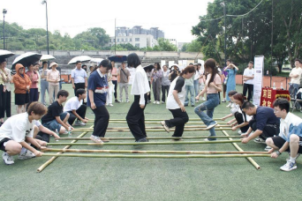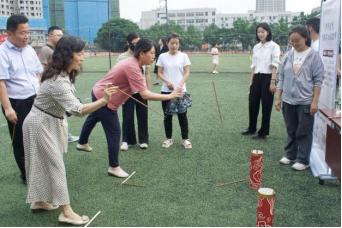 踏歌起舞,竹韵飞扬。人气最高的当属竹竿舞体验项目,在这里,严肃博学的老师们成为虚心求教的“学生”,现场教学、沉浸式体验,在有节奏、有规律的抨击声中,教师们或敏捷、或谨慎地进退跳跃,在竹竿分合瞬间,师生的心更近了,师生与传统文化的距离也更近了。