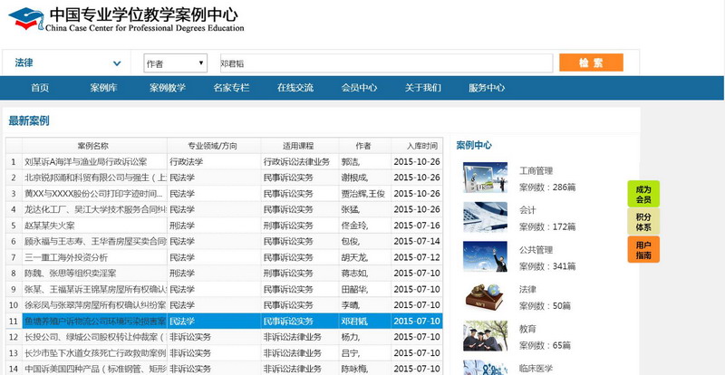 邓君韬副教授编撰的案例《鱼塘养殖户诉物流公司环境污染损害案》入选中国专业学位教学案例中心(China Case Center for Professional Degrees Education)“中国法律专业学位教学案例库”。