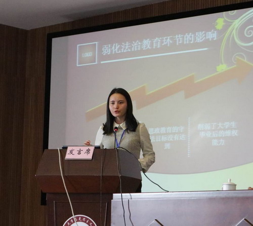2014级法学硕士研究生罗娟向论坛提交《全面依法治国背景下大学生思政教育中法治意识教育强化路径研究》一文,在依法治国的大背景下,通过思政教育中法治教育不足的表象深层次地挖掘了导致这一现象出现的原因,并进行相应的对策分析。经过专家的提议,罗娟同学在论坛上做10分钟的主题发言。