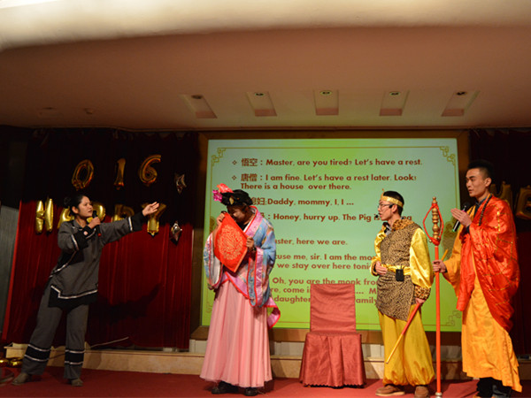 整个晚会精彩纷呈,高潮迭起,表演形式丰富多样,内容新颖。戏谑、滑稽的《三句半》,讲述新生初来乍到所见、所闻,获得了场下观众的一致好评;妙曼的摩登舞《月半小夜曲》旋律动人,用舞蹈的艺术诠释乐曲深深的哀愁;学生工作组的老师们也为晚会献唱一曲《异乡人》,让同学们看到了老师们不一样的面貌,纷纷献花鼓掌。小品《猪八戒背媳妇儿》英文版笑点十足,猪八戒人物形象实在令人捧腹,表演到位,让人拍手,将整个晚会推向高潮;合唱《红蜻蜓与斗牛士之歌》悠扬、高亢,连微信墙也被观众们的赞美刷屏;深情的诗朗诵《有一种爱情叫做民国》优美、感伤,使场下观众感动的热泪盈眶,富有情感的表演也将人们带入了民国时代。