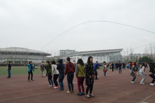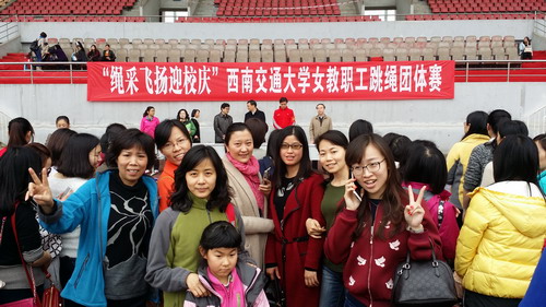 2016年3月8日14点,由校工会、体育部主办的纪念“三八”国际劳动妇女节106周年,全校女教职工跳长绳团体赛在犀浦校区北区体育场举行,全校各部门工会女教职工积极、踊跃参与,以饱满的爱校情怀和抖擞的精神面貌迎接学校120周年校庆。出席此次活动的嘉宾有校党委副书记陈志坚,校工会主席罗乾超,副主席郑江、盛鹏,体育部副主任刘江,各二级部门工会主席、参赛队领队及运动员。公共管理与政法学院副书记余小英、工会主席王崇杰、韩文丽、杨建老师、易恬、张荣荣、刘建萍、陈冬菊、赵彦辉等参加了此次比赛。