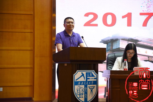 典礼第五项为教师代表发言。吕辉老师的演讲令参会成员印象颇深。他向领导、同学和全体老师提出了诚挚的感谢,感谢领导能给他上台演讲的机会;感谢学生能选择交大;三是感谢所有老师的辛勤付出。同时他也教导同学们要好好规划人生、事业和学业,还要学会思考,提升综合素养,更重要的是学会感恩,感谢每一个帮助过你的人。吕辉老师的讲话发人深思,在场的每一位成员都仔细聆听,认真思考,细细地品味着话语的内涵。话音刚落,现场就爆发出热烈的掌声。