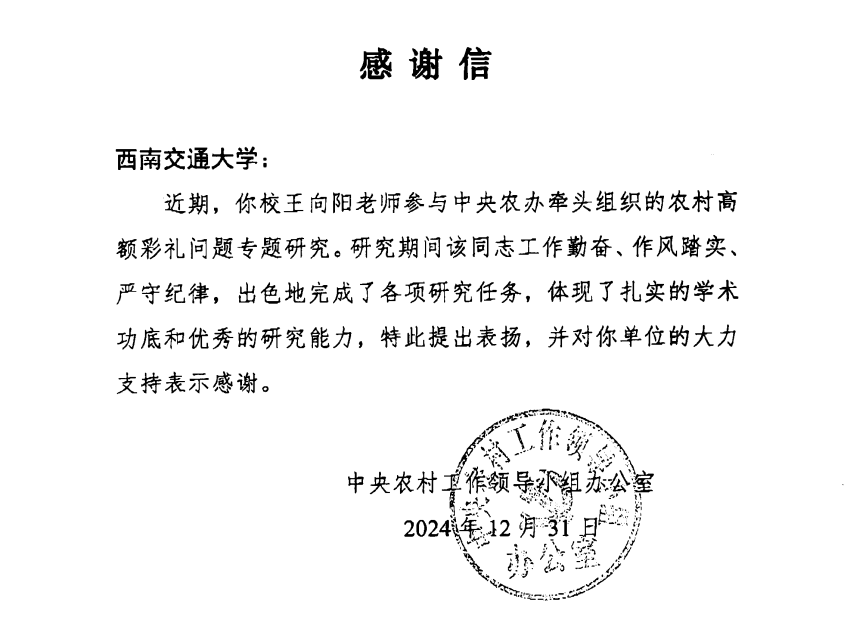 王向阳老师在中央农办牵头组织的高额彩礼问题专项研究工作中积极献言献策表示感谢。感谢信中写到,研究期间,王向阳老师工作勤奋、作风踏实、严守纪律,出色地完成了各项研究任务,较为充分地体现了91毛巾哥