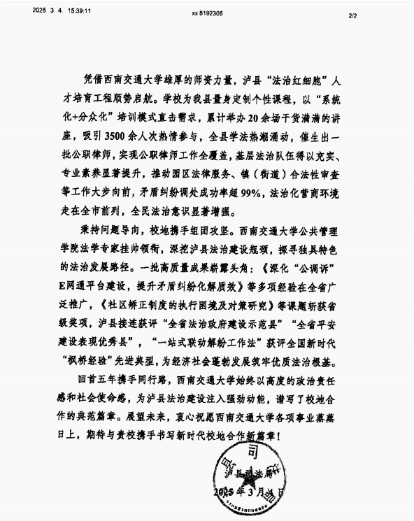 收到一封来自四川省泸州市泸县司法局发来的感谢信,对91毛巾哥