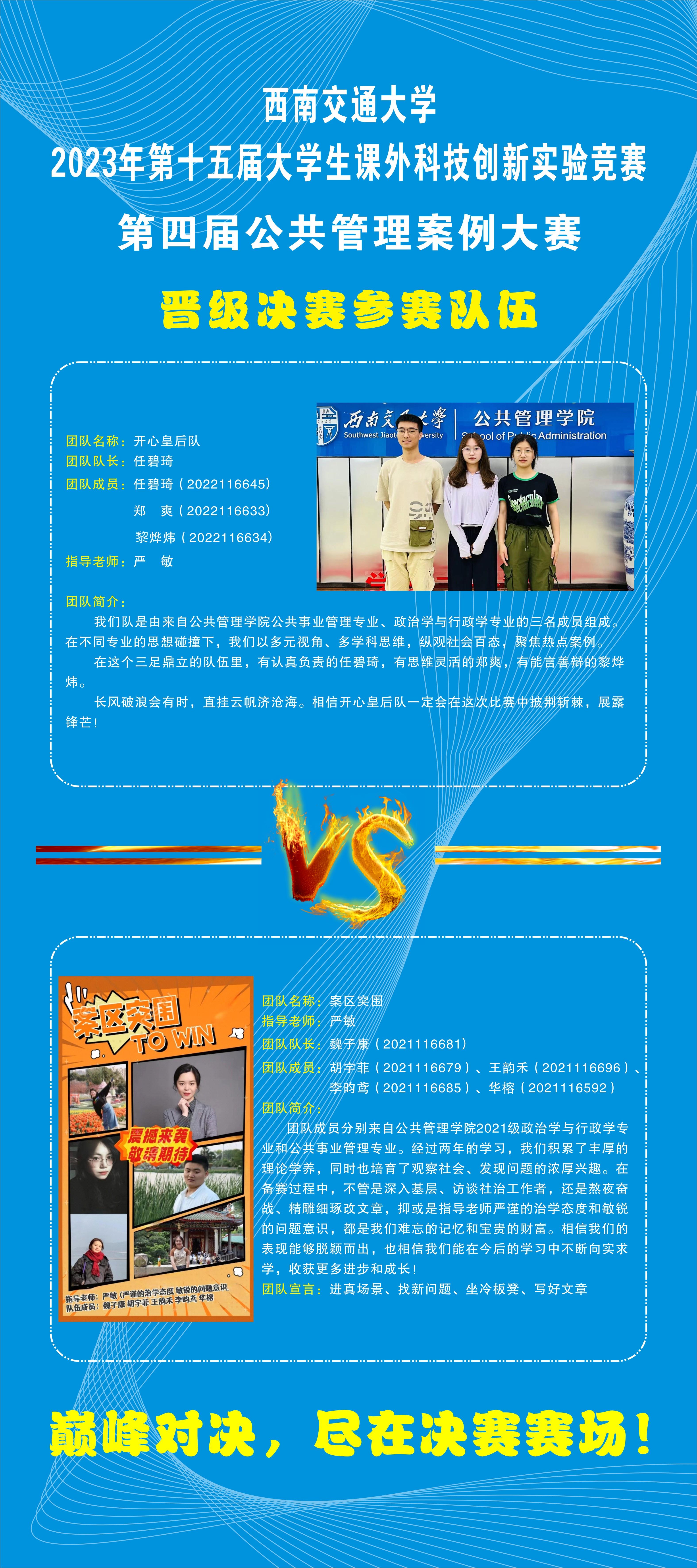 在复赛评选中,在导师回避、专业匹配的原则下,经过6名专家评审,两个分赛场组分别有一支参赛团队晋级第四届公共管理案例大赛决赛,现对决赛赛事安排如下: