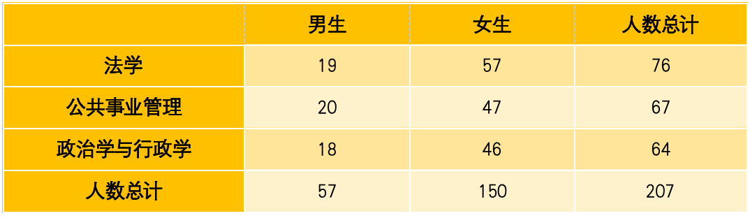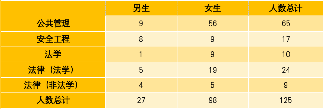 学院现有公共政策与社会管理二级博士学位点,公共管理、法学2个一级学科硕士学位授权点,公共管理硕士(MPA)、法律硕士(JM)和安全工程3个专业硕士学位授权点,公共事业管理、法学、政治学与行政学3个本科专业。