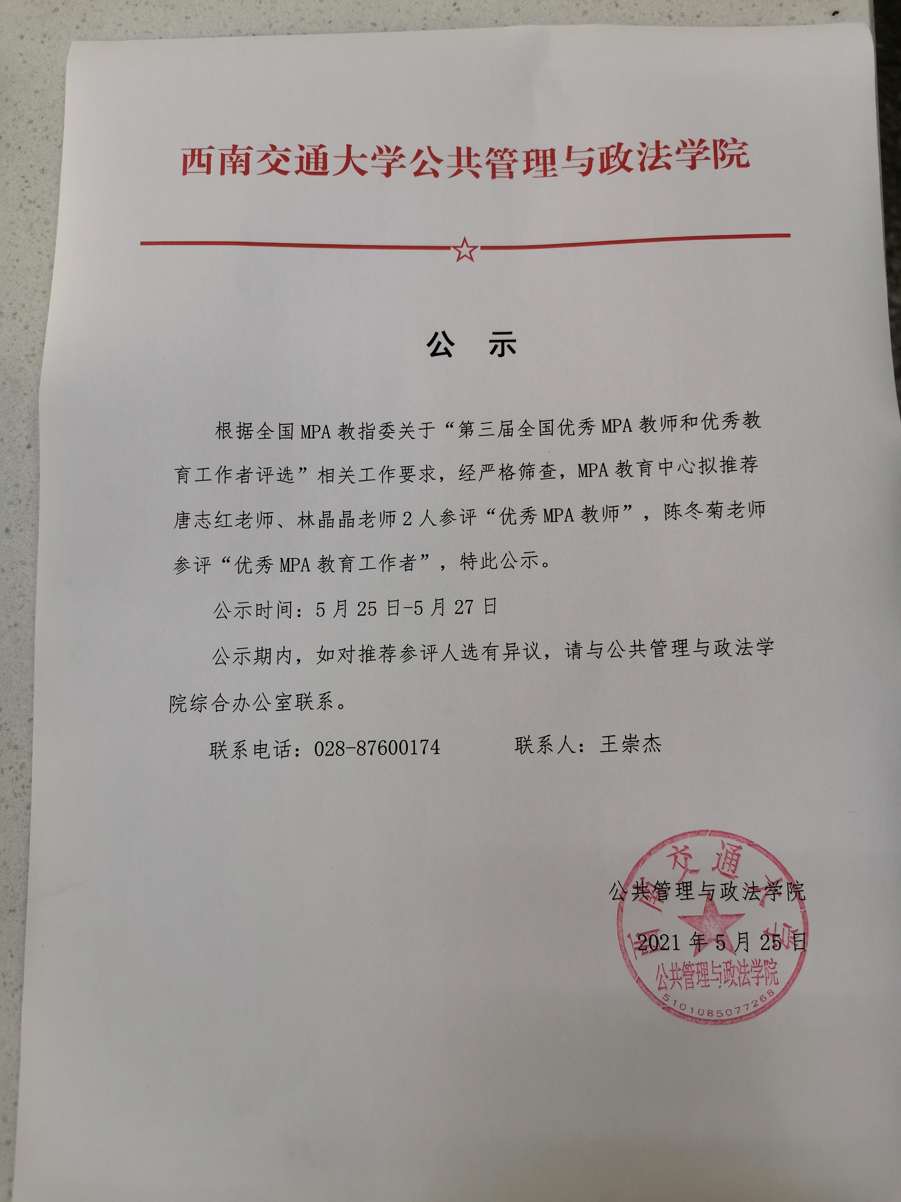 公共管理与政法学院关于第三届全国优秀MPA教师和优秀教育工作者拟推荐人选公示