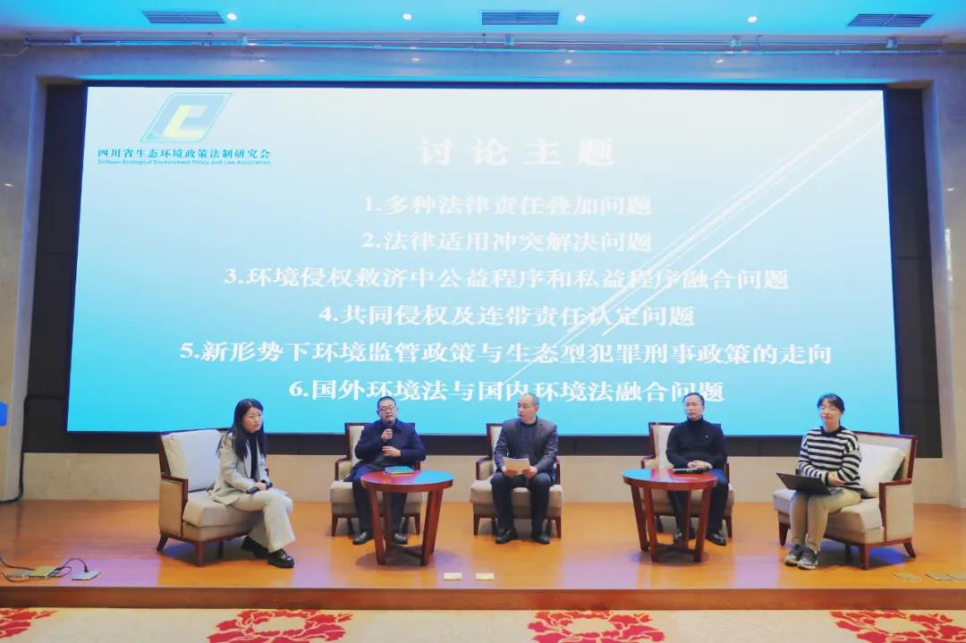 四川省人大常委会法工委副主任杨筠做四川省流域类地方立法主题演讲,四川省环境政策研究与规划院院长罗彬作“习近平生态文明思想和习近平法治思想耦合研究”主旨报告;成都铁路运输第二法院党组成员周冀提出要打造“3+2+1”模式,强化大熊猫保护体系的司法保障;四川省生态环境保护综合行政执法总队二级主任科员就生态环境行政执法的方法、力度与手段进行报告;四川省人民检察院第八部副主任余晶晶就检察公益诉讼助力环境资源生态保护的重要作用做主题发言;四川省环境政策研究与规划院生态文明研究中心副主任刘冬梅报告新时代美丽四川建设的相关内容。
