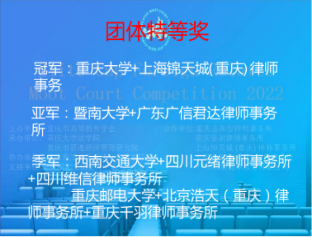 参赛队伍以扎实的专业知识、流利的英语表达、得体的庭辩礼仪和共赢的合作精神,与重庆大学+上海锦天城(重庆)律师事务代表队展开了一场精彩绝伦的唇枪舌战,最终荣获季军。