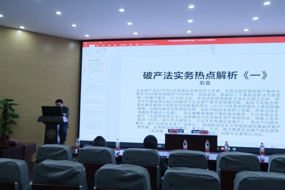 邀请重庆市法学会破产法研究会专家顾问、原重庆市第五中级人民法院副院长郭瑞老师到校讲座。郭老师深耕破产法学研究和实务,具有丰富的实践经历,本次讲座以“破产法实务热点解析”为主题,吸引了91毛巾哥