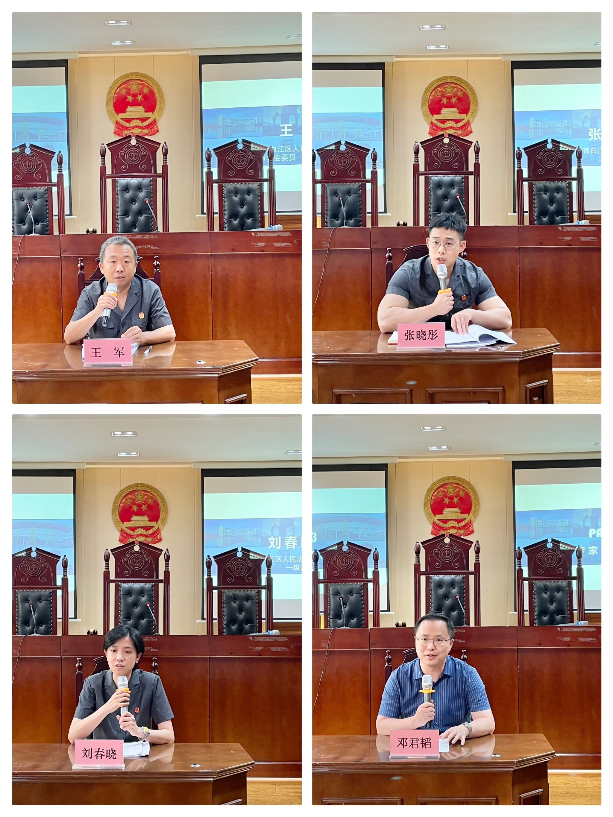 院长助理邓君韬副教授以及法学系系主任魏琼副教授。成都市青白江区人民法院推荐了三位审判专家作为本次模拟法庭竞赛决赛的专家评委,他们分别是青白江区人民法院审判委员会委员、大湾法庭庭长王军、刑事审判庭副庭长刘春晓以及刑庭审判庭员额法官张晓彤,审判专家莅临现场点燃了竞赛的氛围,也让模拟法庭竞赛更加专业与精彩。