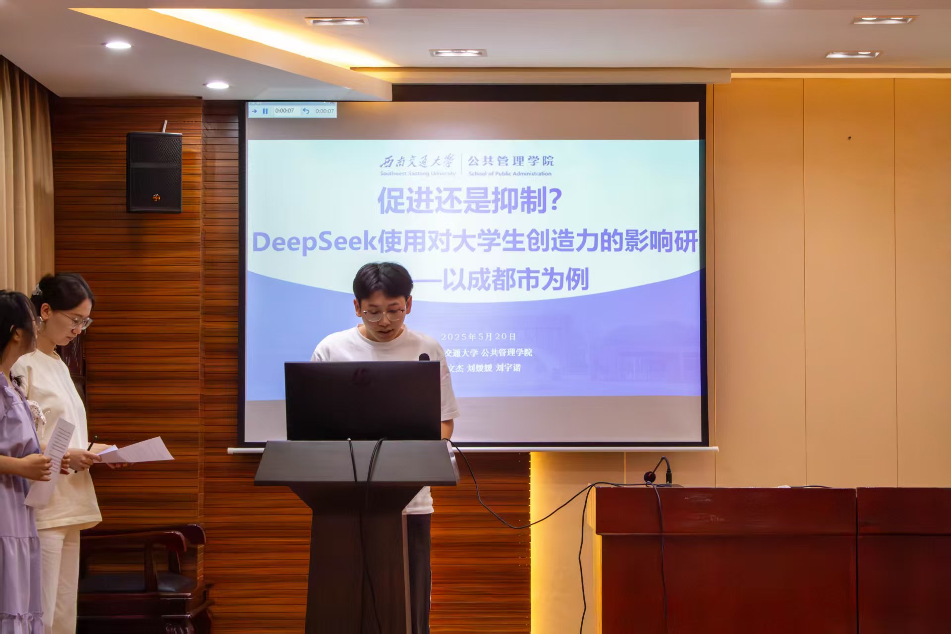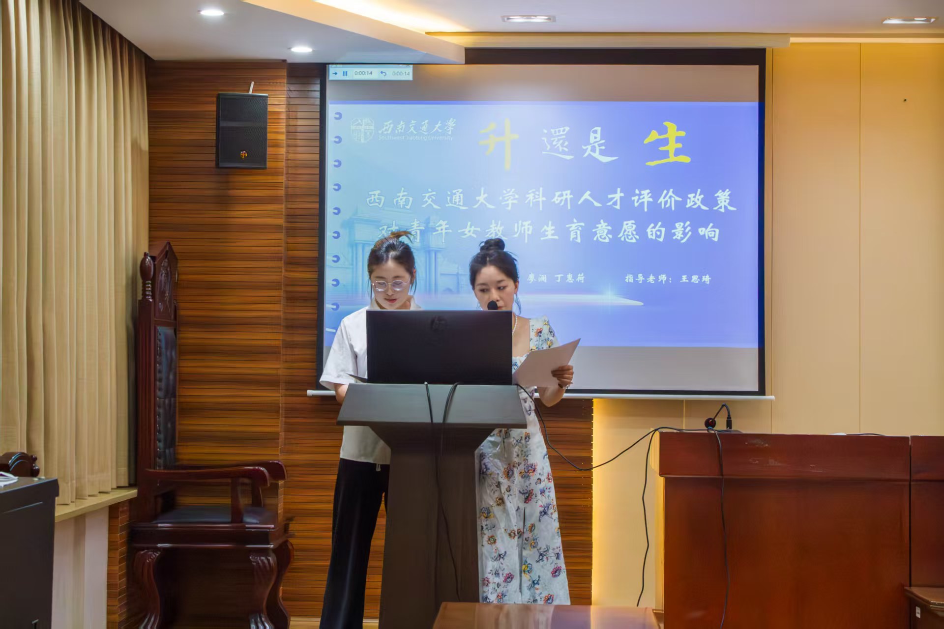 比赛现场气氛热烈,各支队伍的答辩选手在短短十分钟内以扎实的数据分析和创新的研究视角深度剖析社会热点问题。各参赛队伍以文本分析、问卷调研、深度访谈、实地走访为方法基石,融合多重响应分析、关联规则分析等统计分析方法,交出了一份份兼具学术深度与现实温度的调研答卷。调研主题的选择上,各支队伍瞄准社会发展中的现实痛点,关注了女性权益、人工智能发展、养老服务、政府建设、社区治理等真实问题,彰显了“把论文写在大地上”的学术担当。