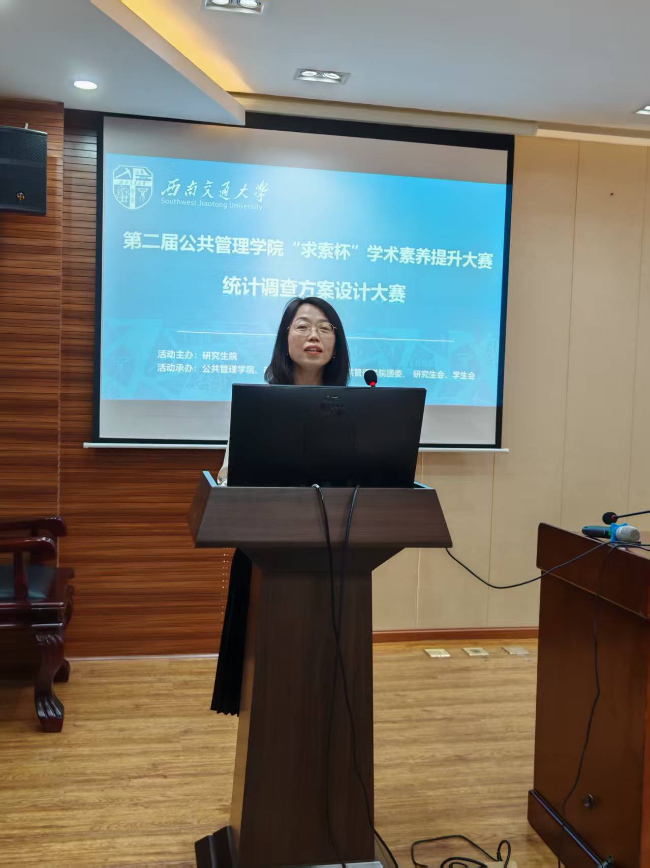 副院长彭川宇为本届比赛致辞。她指出,统计调查方案大赛作为学院传统赛事,为大学生应用统计学基本知识和相关软件来了解分析社会现象提供了重要平台,在大学生社会实践教学中发挥了积极作用。彭院长期待学生借此提升学科素养,预祝比赛圆满成功。主持人介绍完参赛队伍、规则流程后,比赛正式开始。