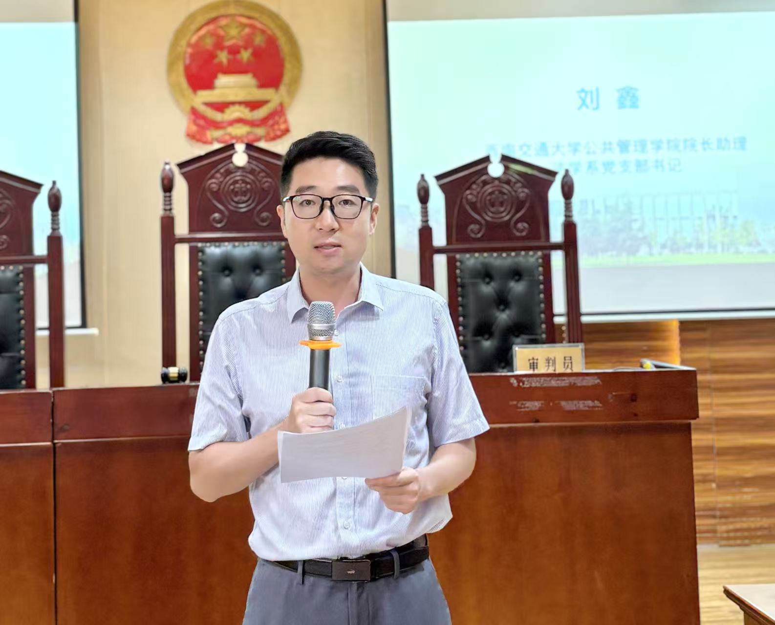 王专委在致辞中高度肯定了模拟法庭竞赛的实践价值。他指出,模拟法庭竞赛是法院为学生们“量身打造”的职业启蒙之旅,这种沉浸式训练是对学生专业知识的综合考核,对培养学生的法律逻辑思维,提升辩论技巧具有深远意义。他满怀期待地鼓励选手们在模拟庭审中充分锤炼自身本领、收获宝贵成长经验,进一步锻炼司法技能,提升实务能力,为投身法治建设打下坚实基础。随后,刘鑫教授对青白江区人民法院在模拟法庭案例支持、专业评审等方面给予的长期大力支持表达了诚挚的感谢。同时,他也鼓励参赛选手们珍惜与法官面对面交流的机会,把竞赛当作学习的课堂、成长的阶梯,在实践中感悟法律的温度与力量,真正实现从“书本知识”到“实务能力”的跨越,淬炼“崇法、尚德、精业、致公” 的法治信仰。