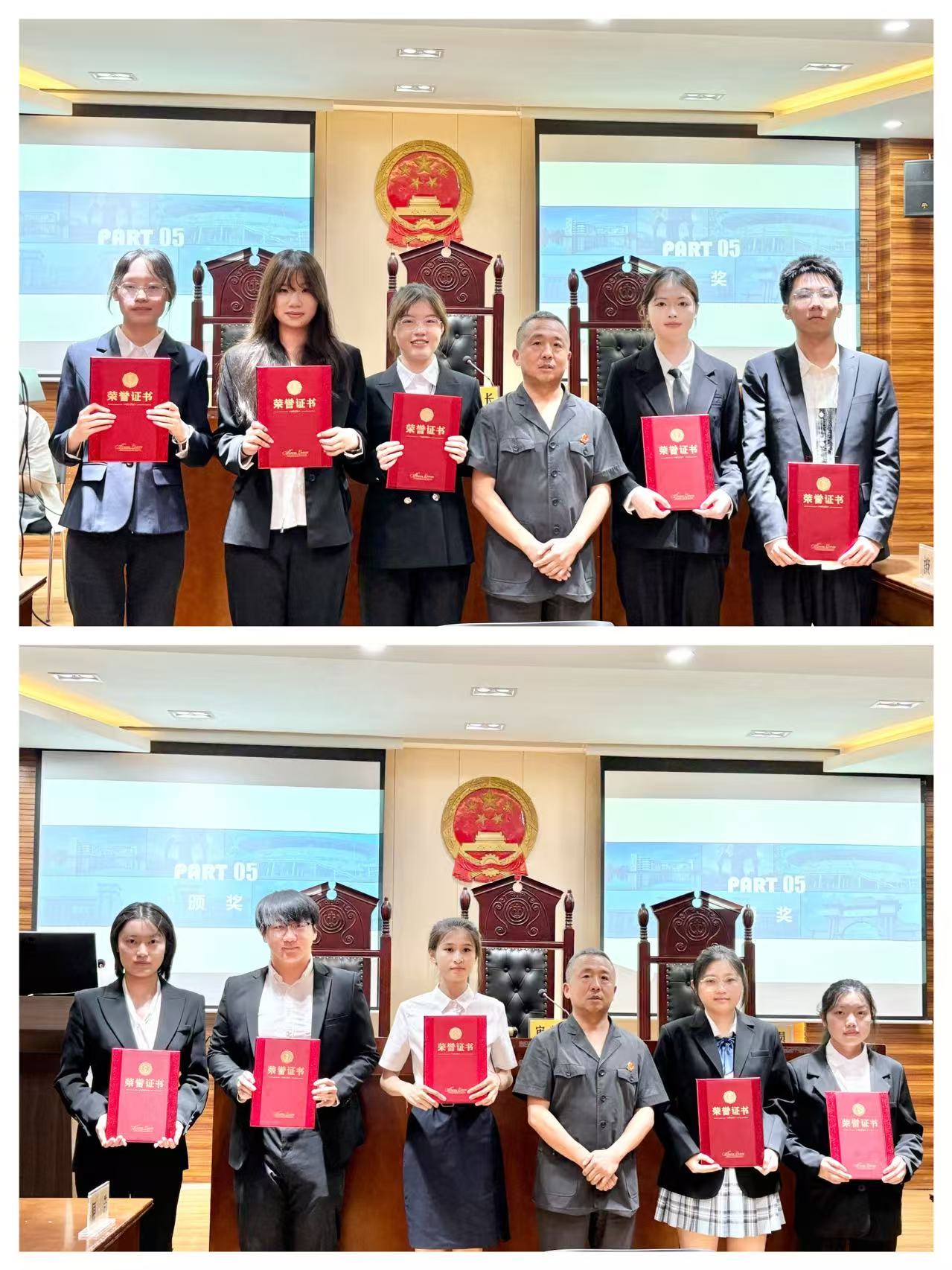 随着评审环节的结束,赛事迎来激动人心的收官时刻。王专委现场揭晓决赛成绩与竞赛最终获奖名单:唐佳坤团队凭借卓越表现摘得桂冠,张轩铭团队荣获亚军,两支队伍共同斩获一等奖;徐雅欣、蒲文静团队获得二等奖;刘雨晨、张书韵、段千羽、谭亦婷四支团队荣获三等奖;李宇轩、宋渤林团队获得优胜奖。随后,王军专委、江铮庭长、马磊副庭长和邓琳惠法官依次为获奖队伍颁发荣誉证书,并与全体参赛选手合影留念,共同记录下这一荣耀时刻。
