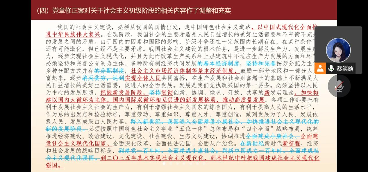 随后,蔡笑晗同志带领大家学习了新党章主要修订内容,为了进一步增加大家对新党章的理解,蔡笑晗同志还为大家介绍了新旧党章的区别。新党章在以下内容做出了调整:新党章充实完善习近平新时代中国特色社会主义思想的科学内涵和历史定位;对党的奋斗目标的表述作了调整和完善;增写党的百年奋斗重大成就和历史经验;对关于社会主义初级阶段的相关内容作了调整和充实;在“五位一体”总体布局方面进行充实;对国防和军队建设、统一战线、外交工作等方面的内容作了修改;对党的建设总体要求作了调整充实;在坚持党的全面领导方面进行了充实;对党员和党的干部提出了新要求;对党的基层组织和党组作出了新规定;对党的纪律、党的纪律检查机关两章作了调整和完善。