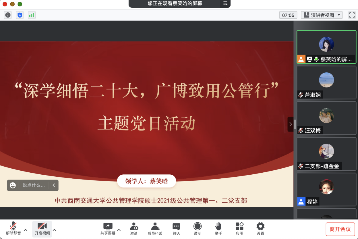 中国共产党第二十次全国代表大会在北京胜利闭幕,大会审议通过了关于《中国共产党章程(修正案)》的决议,新党章顺应时代要求、体现全党意志、反映人民心愿,是马克思主义中国化、时代化最新成果。为进一步学深用好新党章,贯彻党的二十大精神的重要内容,2022年11月28日19:00,硕士2021级公共管理第一党支部、第二党支部联合开展了“深学细悟二十大,广博致用公管行”为主题的党日活动。为切实做好校园疫情防控工作,本次采用线上腾讯会议的方式加以开展。