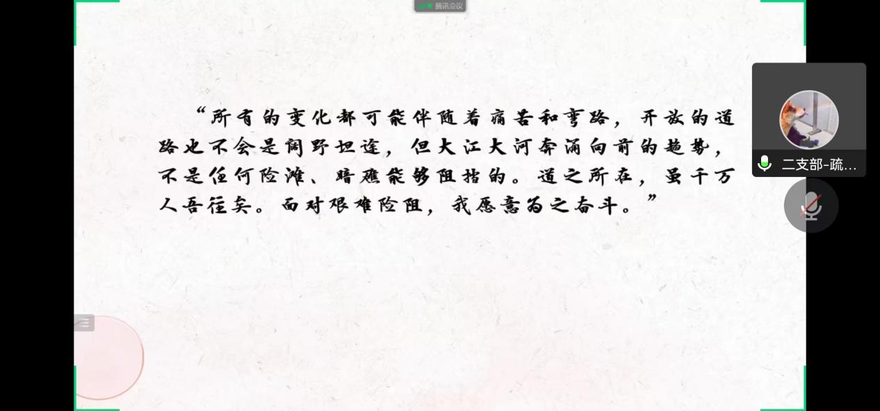 最后疏金金同志结合最近时事热点寄语大家:“所有的变化都可能伴随着痛苦和弯路,开放的道路也不会是阔野坦途,但大江大河奔涌向前的趋势,不是任何险滩、暗礁能够阻挡的。道之所在,虽千万人吾往矣。面对艰难险阻,我愿意为之奋斗。”