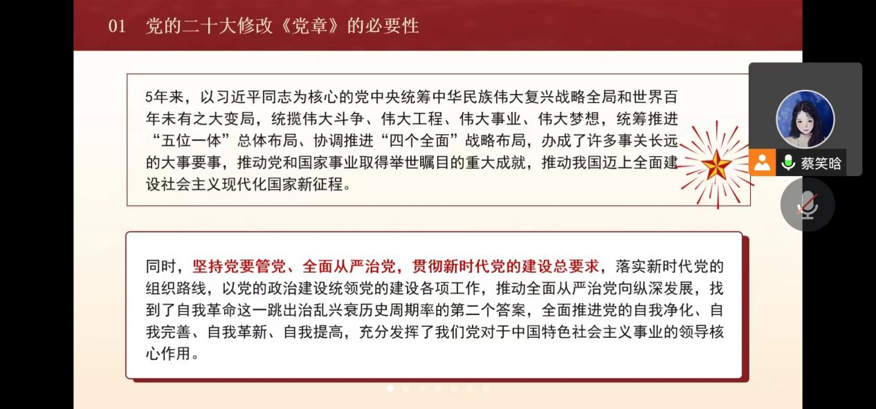 蔡笑晗同志先从新党章修改的必要性讲起,她首先指出:“习近平新时代中国特色社会主义思想的真理力量和实践伟力更加凸显,得到全党全军全国各族人民广泛认同和拥护,全党同志更加深刻地认识到‘两个确立’的决定性意义。修改党章是全面推进党的自我净化、自我完善、自我革新、自我提高的举措,充分发挥了我们党对于中国特色社会主义事业的领导核心作用。”