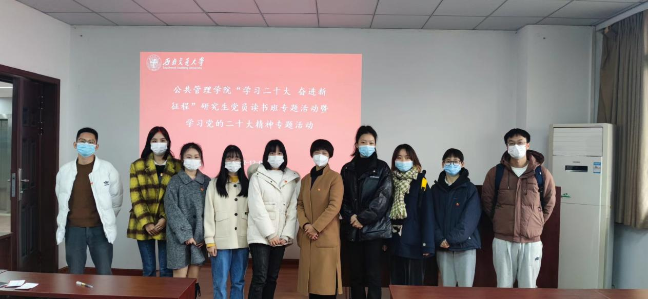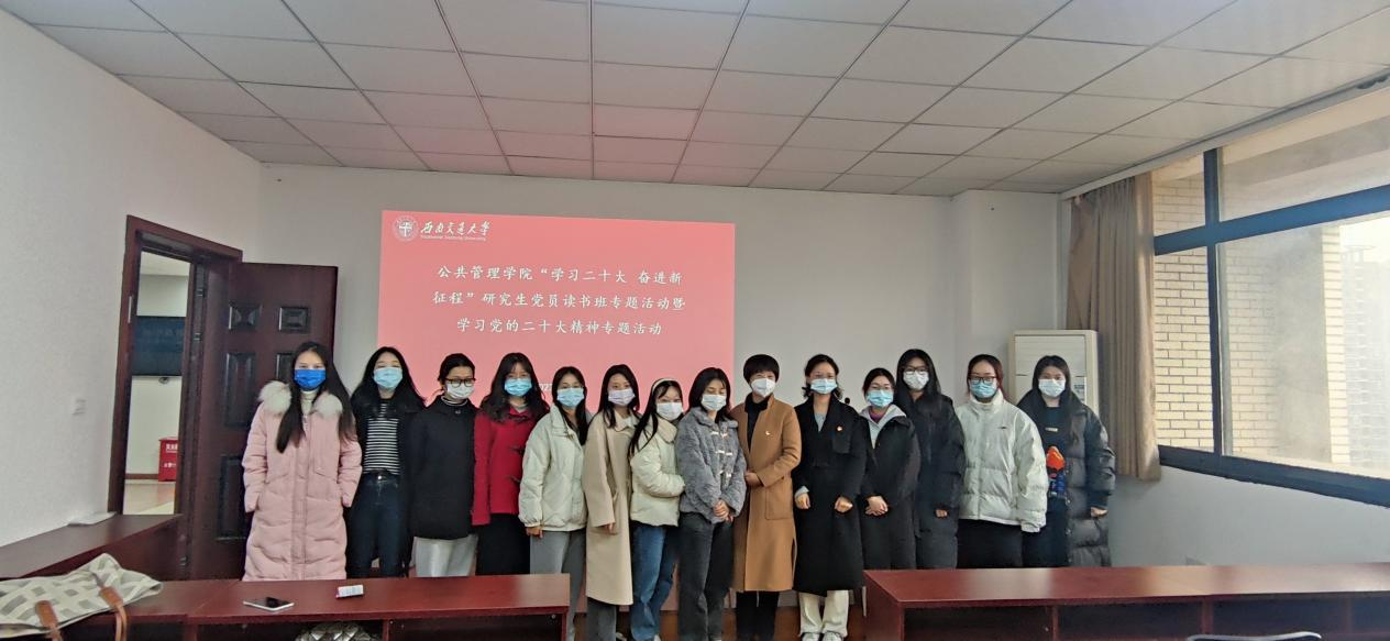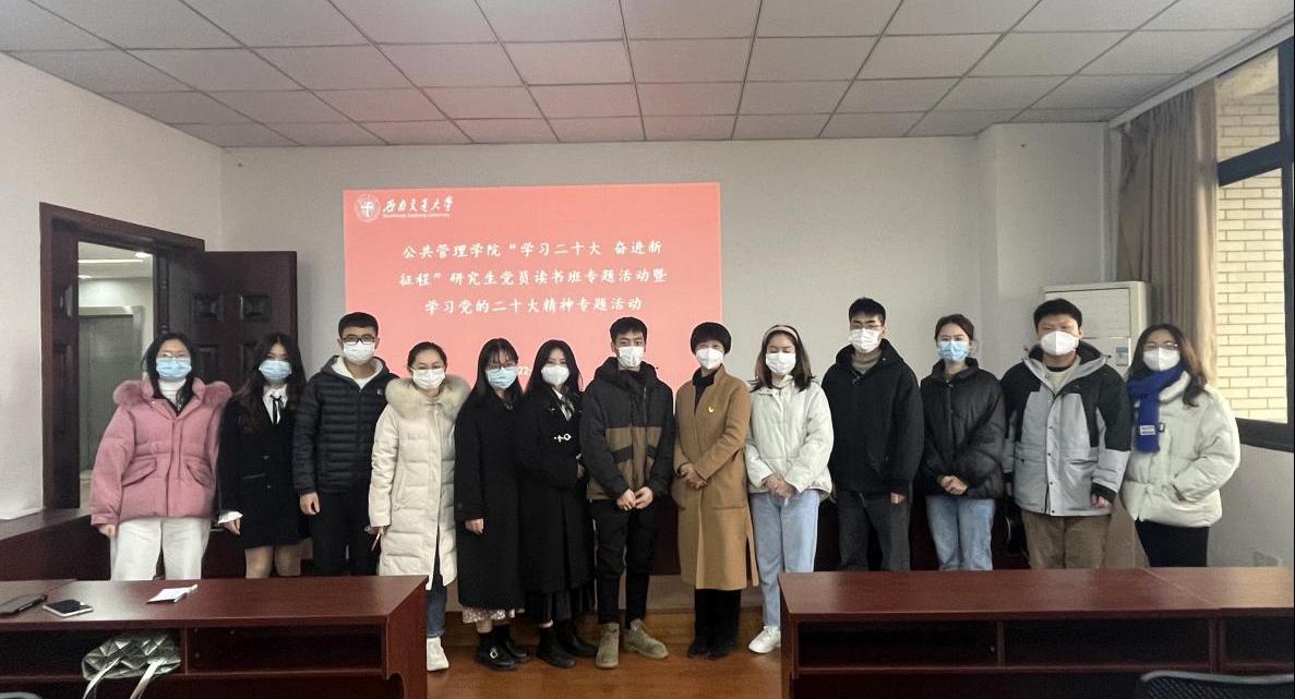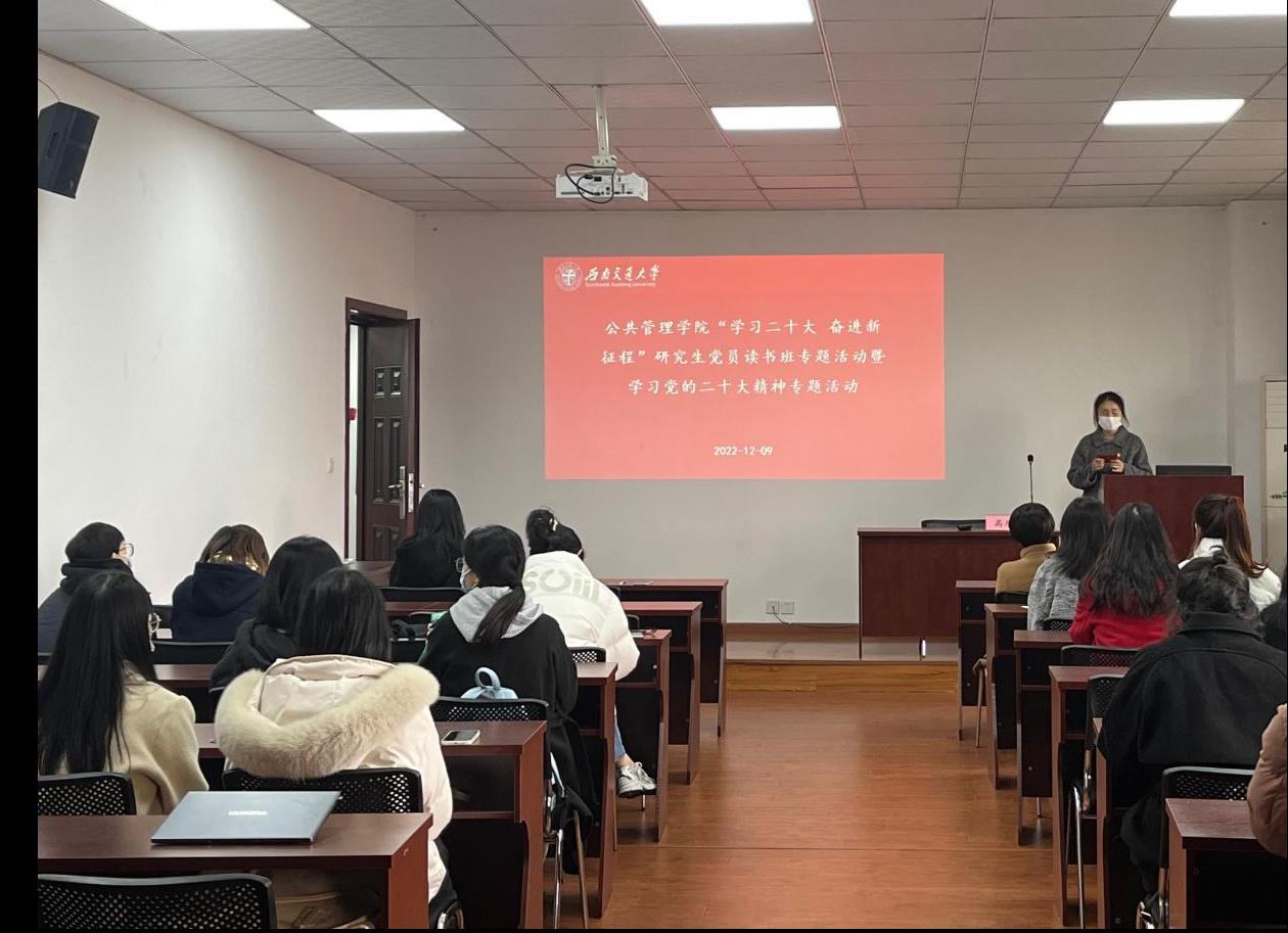 在九里校区零号教学楼01105组织开展“学习二十大 奋进新征程”研究生党员读书班暨学习党的二十大精神专题活动。出席本次活动的领导嘉宾有学院党委书记高凡,学院研究生辅导员莫太林老师和赵诚然老师,学院2022级全体研究生党员参加了此次活动。