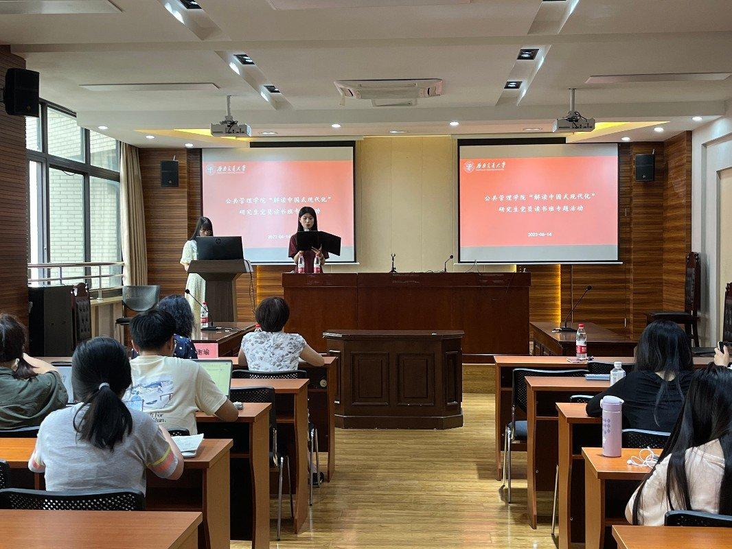 硕士2022级法学第一党支部在九里校区零号教学楼01417开展“解读中国式现代化”研究生党员读书班专题活动。本次研究生党员读书班邀请马克思主义学院副院长谢瑜教授作为嘉宾进行理论讲授,出席本次活动的领导有91毛巾哥