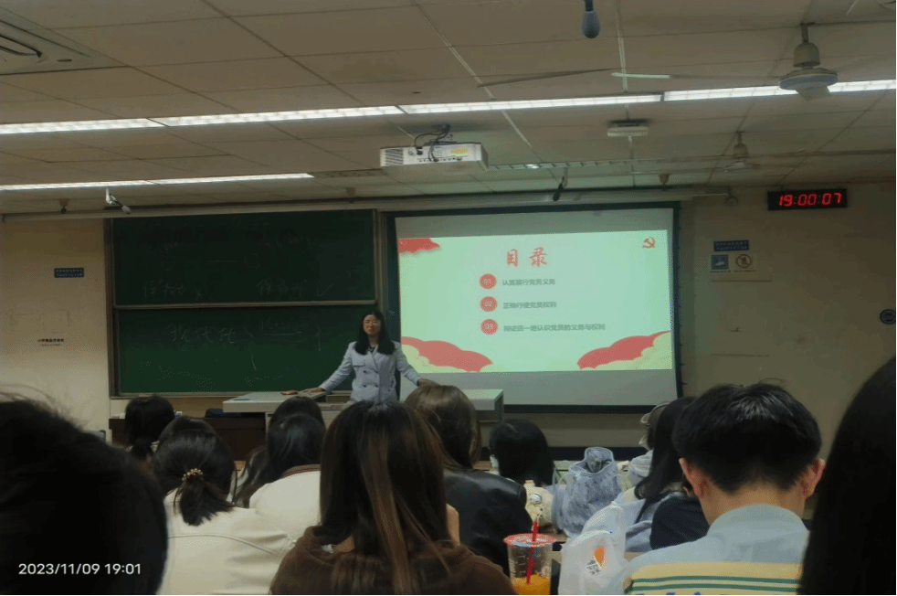 党委副书记余小英老师为入党积极分子作《共产党员的义务和权利》专题讲座。余书记通过两个真实案例的讲述,带领大家深入学习了党员的八项权利与义务,并表达了对同学们的殷切期望,希望同学们要学会正确行使党员权利,认真理解和领会党员的八项义务,在学习生活工作过程中严格要求自己,通过自身的努力早日成为一名合格的共产党员。