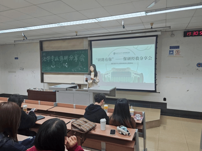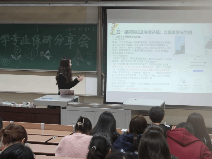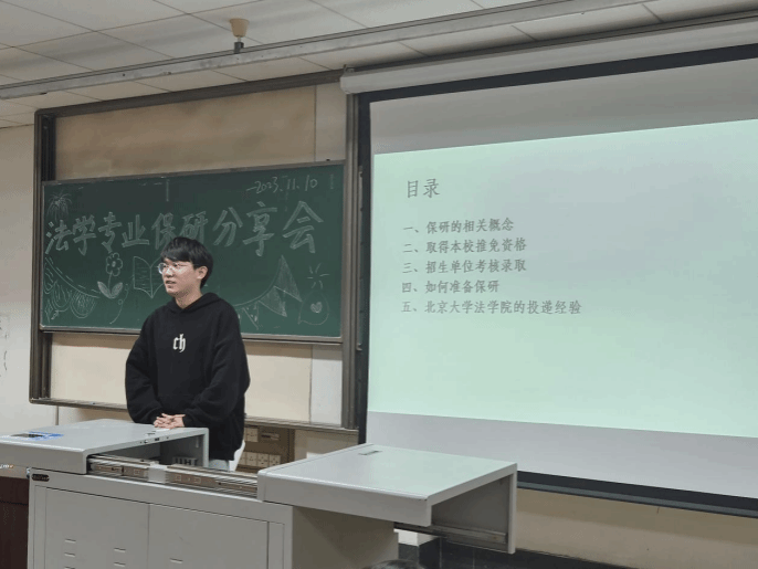 韩蒙恩同志首先为同学们讲述了保研的真正概念和含义,其次对如何取得本校保研资格以及如何准备保研进行了细致的分享,最后为同学们介绍了北大法学院的投递经验。