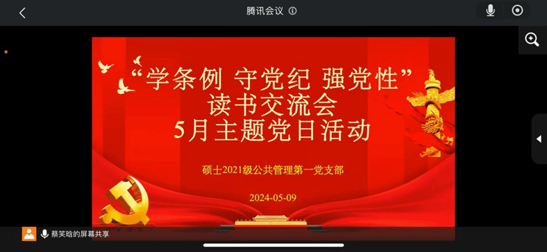 5月9日,硕士2021级公共管理第一党支部组织学习。党支部书记蔡笑晗同志向参与学习的同志们详细介绍了《中国共产党纪律处分条例》制定修改的历程,她认为,党员同志必须坚守初心使命,牢固树立政治意识、大局意识、核心意识、看齐意识,切实践行正确的权力观、政绩观、事业观,自觉遵守和维护党章,遵守国家法律法规。