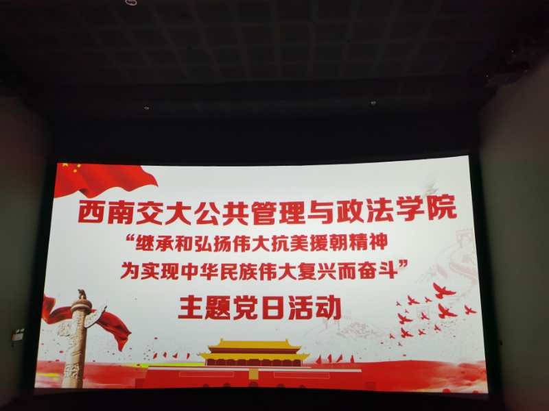 2020年11月12日下午,公共管理与政法学院党委组织全体党员师生参加以“继承和弘扬伟大抗美援朝精神,为实现中华民族伟大复兴而奋斗”为主题的党日活动,各师生党支部的部分代表参与其中。此次主题党日活动的主要内容是前往影院观看抗美援朝影片《金刚川》,以观影为手段,直观的感受老一辈革命者不畏强敌,浴血奋战的精神。