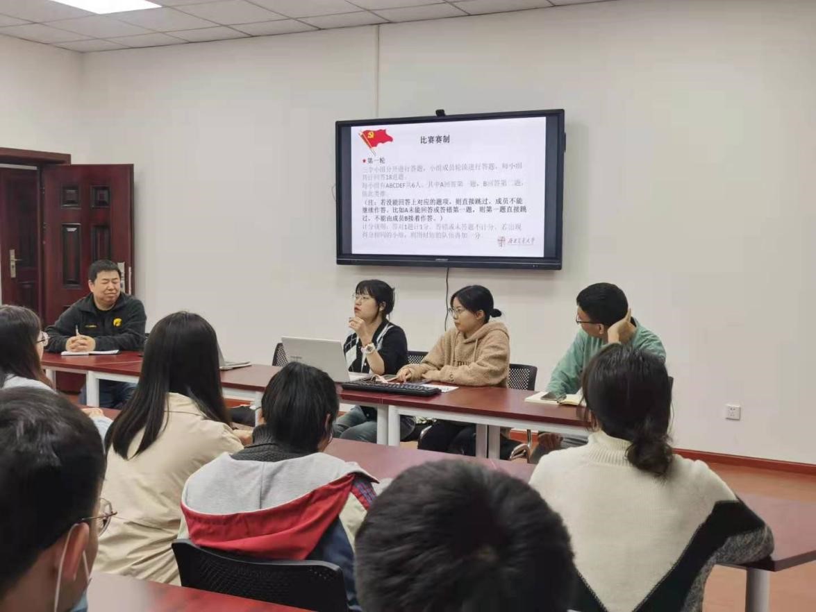 为深化“四史”学习教育成果,深入学习贯彻习近平新时代中国特色社会主义思想,喜迎中国共产党建党100周年,按照学校党史学习教育工作部署,公共管理与政法学院硕士2020级公共管理第二党支部于2021年4月11日20:00在九里校区01108会议室开展了“不忘初心·不负韶华”主题党日活动,活动以党史知识竞赛形式开展,比赛由范锡林、吴佳霖、魏秋芳、黄丽萍四位同志主持,学院副院长雷叙川及支部全体成员参加。