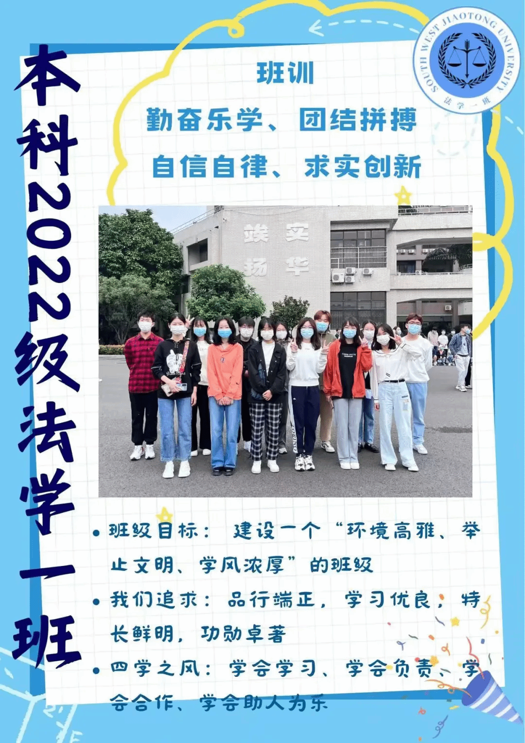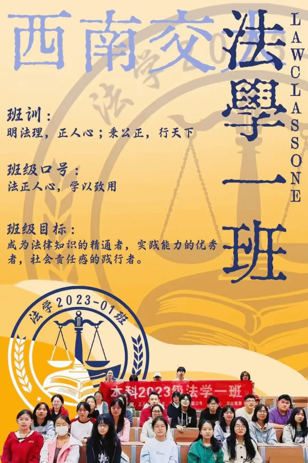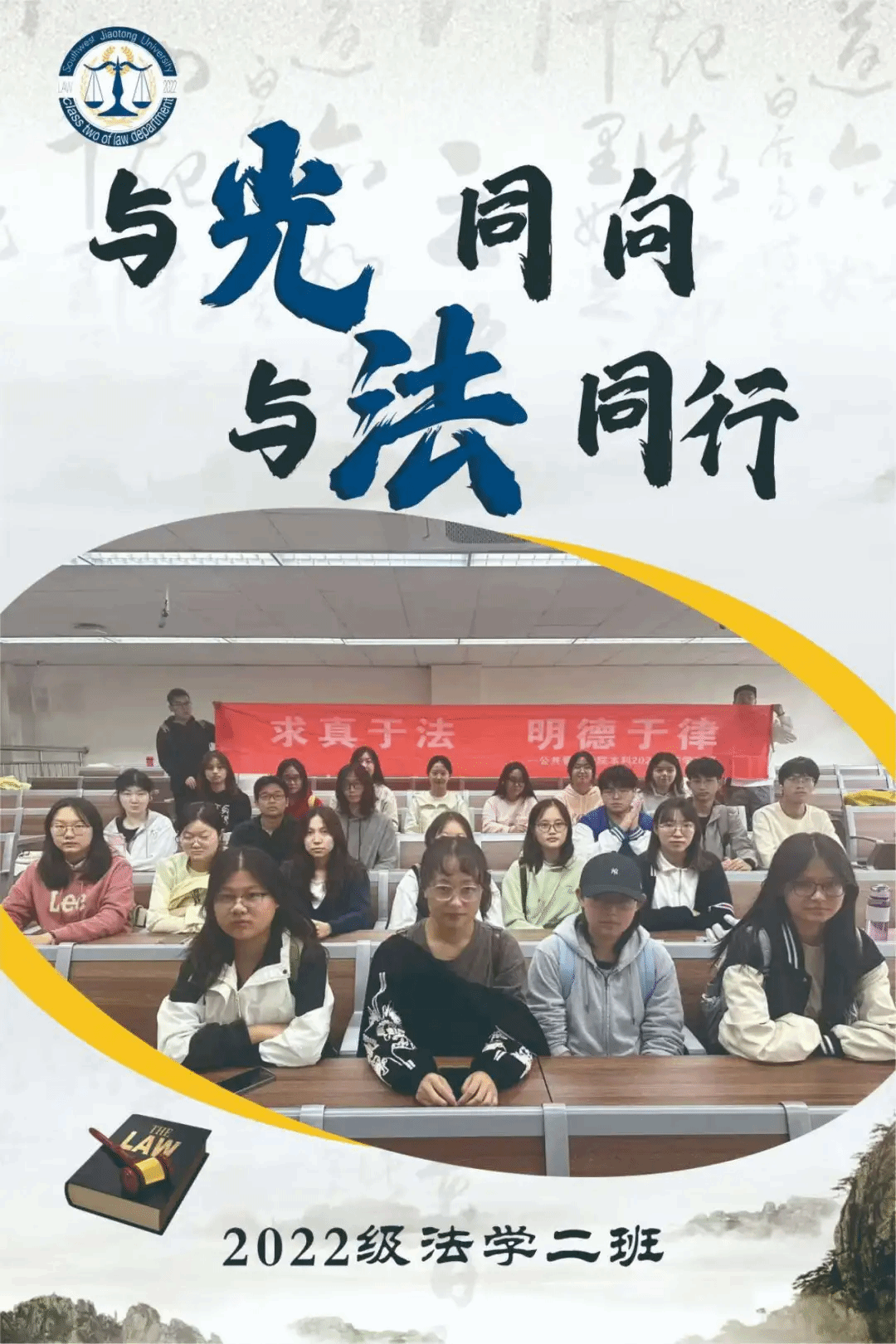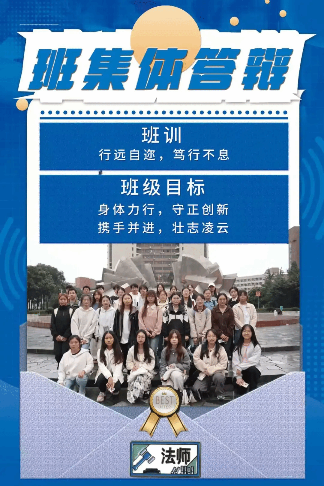 班级介绍:法学2022-02班,一个团结向上,积极奋进的班集体,汇聚36个活泼有趣,认真努力追逐梦想的少年,在过去一学年里,我们渴望学习,渴望进步,渴望成长。在法学2班这个温暖的大家庭里,我们共同面对挑战,积极开展班级模拟法庭大赛,接触新鲜领域,共同分享喜悦,共同学习进步,开展读书交流为主题的班会,沐浴书香,在法律书本的海洋里遨游;我们自信积极,在各种竞赛中散发光芒;我们善良热情,积极参加志愿公益活动。乐观向上是我们的主旋律,在追寻梦想的路上我们从不孤单,互相鼓励,互相支持,我们不是最好,但力求更好是我们的宣言!