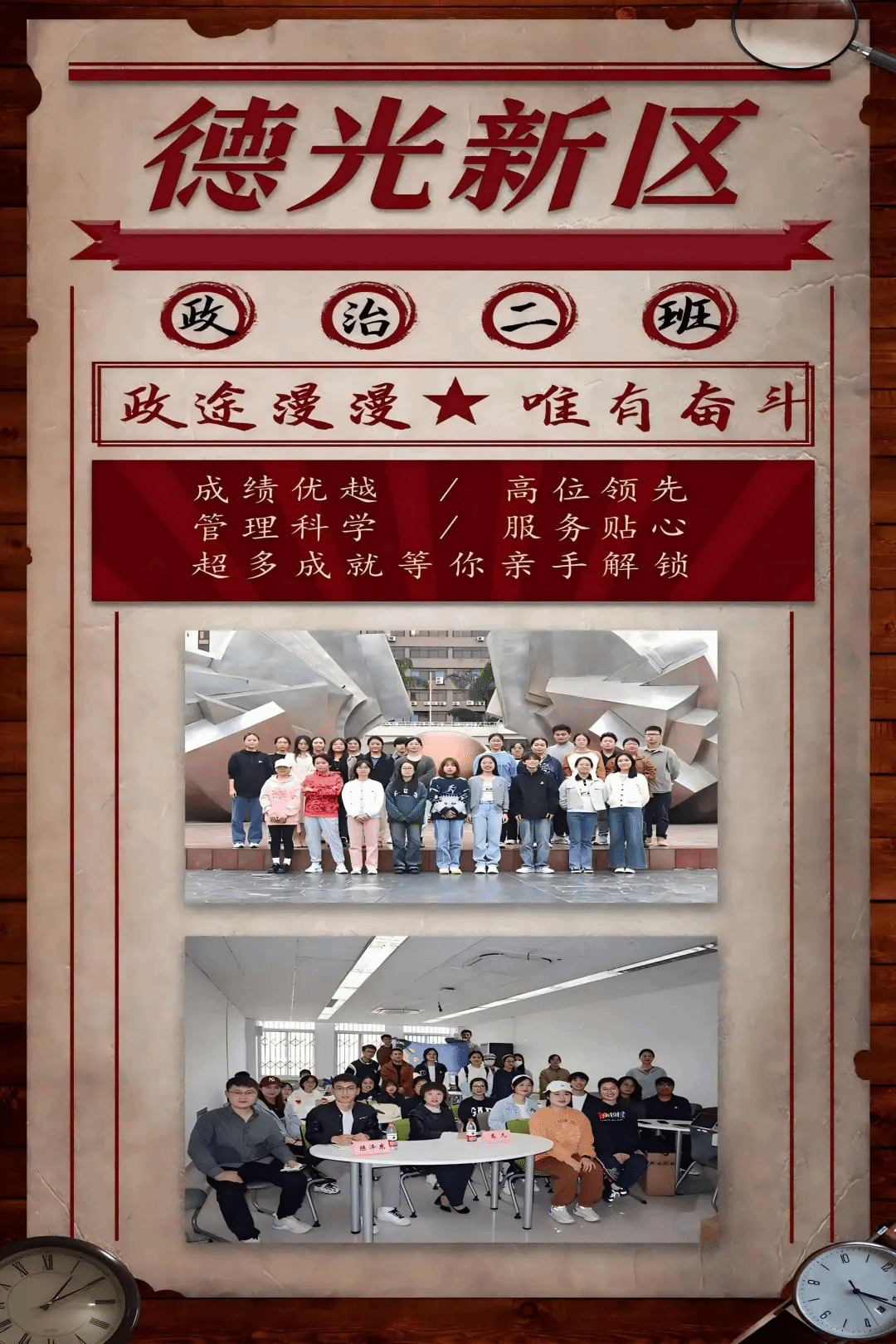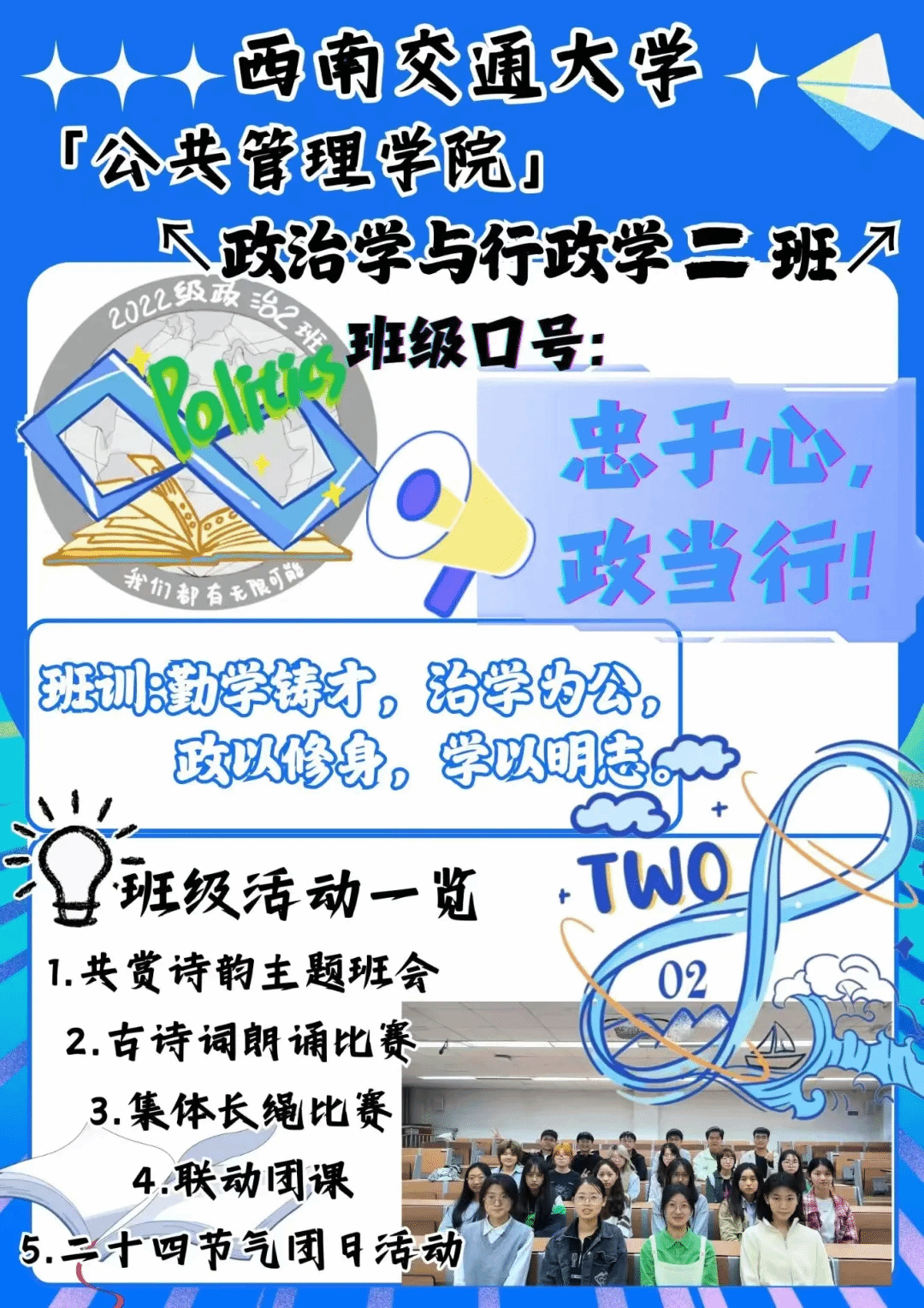 班级介绍:政治2022-02班的同学们,恪守着“勤学铸才,治学为公,政以修身,学以明志”的班级班训,以团结向上的姿态,彰显了班级昂扬的精神风貌和强大的凝聚力。我们是在主题班会上与老师积极互动,不断自我提升的忠政学子;是在跳绳比赛中尽情挥洒汗水,勇夺佳绩的忠政团队;也是在主题团日活动中与兄弟学院、不同专业的同学们携手合作,相互学习的忠政集体;更是在古诗词比赛的朗诵环节中,共同探索中华传统文化之美的忠政伙伴。这便是我们“忠于心,政当行”的忠政精神,这便是“忠政不贰”这个团结的集体。