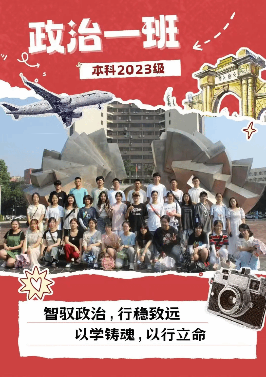 班级介绍:川蜀群峰皆好客,政二今始为君来。政治2023-02班32位同学始终坚持以诚挚的热情,面对学习、生活中的每一个舞台,展现自己的特长,描摹最青春的自我。这32位同学,虽然来自祖国的五湖四海,但是他们用自己的热情和善良构建了一个和谐团结的班集体,用自己的努力创造了一个精彩多样的大一生活:无论是在院青协中着力奉献,还是在学生会中展现自我;无论是金榜题名,学习方面勇踏潮头,还是慷慨激昂,丈量祖国大好河山,班集体中的每一位同学都各具特色,都是政治二班这个大家庭中独特闪耀的一份子。鹏程九霄,抵南海娓娓不倦;龙腾万里,跨三界久久为功。路有繁花,前有硕果,政治二班不倦前行,终不负积年奋进之功。