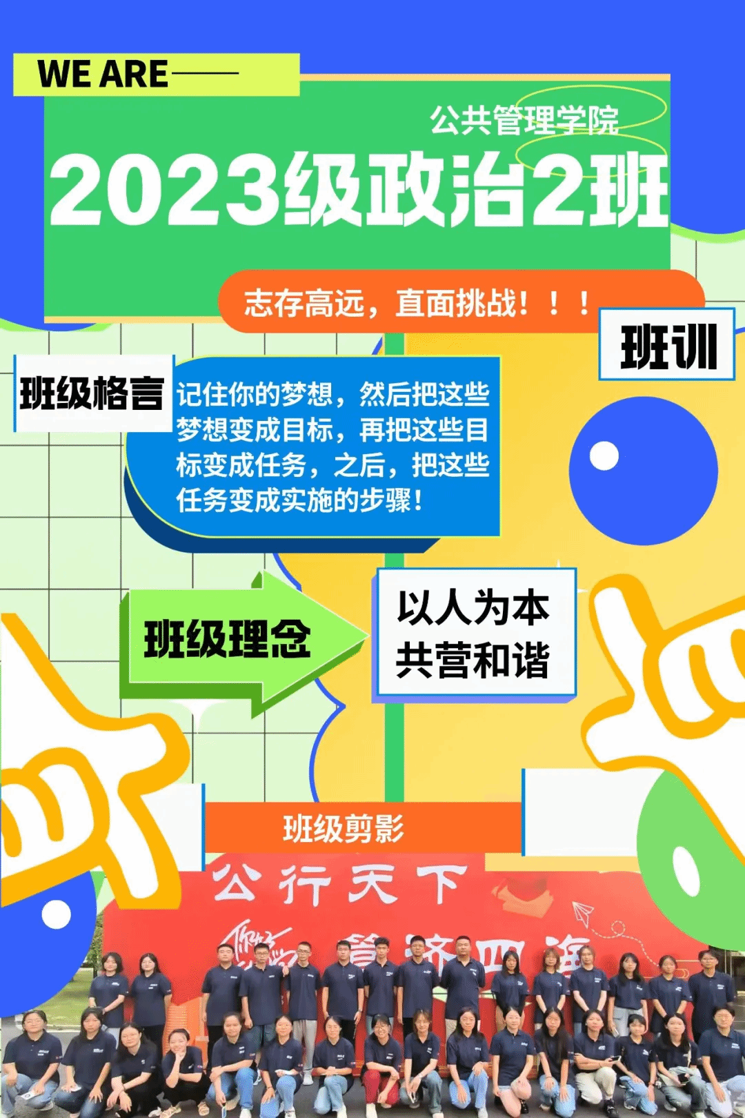 班级介绍:政治2023-01班,是一个由33名活力四射、青春开朗的大学生组成的团结向上的大家庭。“鲜衣怒马少年时,不负韶华行且知”,政治一班坚定地践行“以学铸魂,以行立命”的班训,积极参加各种学术学科竞赛以及文体活动,追求卓越,认真学习,不仅取得成绩的收获,更促进了自身的发展。“自信人生二百年,会当水击三千里”,政治一班的同学们独立自主,各怀主见,共同践行着自由发展的理念。在班级这个大家庭中,每位同学都能依据个人志趣,投身于自己热爱的领域,不为外界功利所扰,只为内心深处那份纯粹的热爱与追求。少年何妨梦摘星,敢挽桑弓射玉衡。恰逢青春时,政治一班的33朵蒲公英们,让我们共同成长,努力奋斗,飞向我们梦想实现的彼岸!