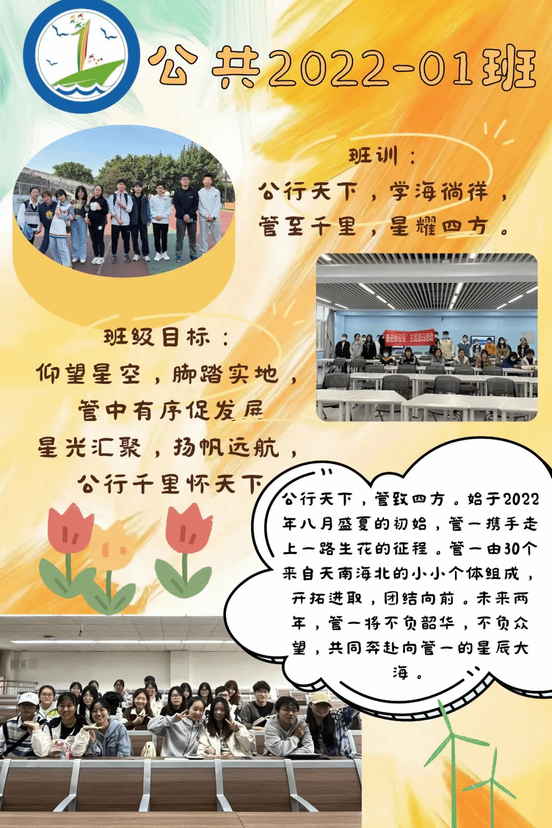 班级介绍:公行天下,管致四方。始于2022年八月盛夏的初始,管一携手走上一路生花的征程。两年的时光中,德育潜移默化,树立正确价值;智育浇灌素养,营造勤学氛围;体育强健体魄,赛场展现雄姿;美育陶冶情操,丰富个人阅历;劳育躬身实践,崇尚务实风范。山山而川,人生海海。两年的时光中,管一由30个来自天南海北的小小个体,制定班级有序的管理,营造互相友爱的环境,树立积极向上的姿态,奋勇争先,多位同学在学术科研、文体竞赛、社会实践多个领域崭露头角,绽放光芒。未来的时光里,管一将不负韶华,不负众望,奔赴向管一的星辰大海。