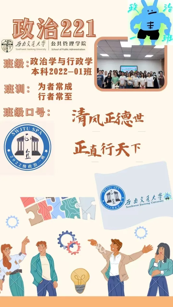 班级介绍:“清风正德世,正直行天下。”当演讲遇上动画,游戏遇上运动,写作遇上摄影,政治2022-01班可以说是“卧虎藏龙”!我们的梦想从这里开始,两年以来,我们互相鼓励,共面困难,存心苍穹,书浩然正气。人文渐长,仁德治廉是我们前进的方向;涅槃重生,奋发图强是我们不变的理想。“为者常为,行者常至。”不问终点,全力以赴的是政治一班的我们。愿政治一班的我们玉汝于成,功不唐捐。