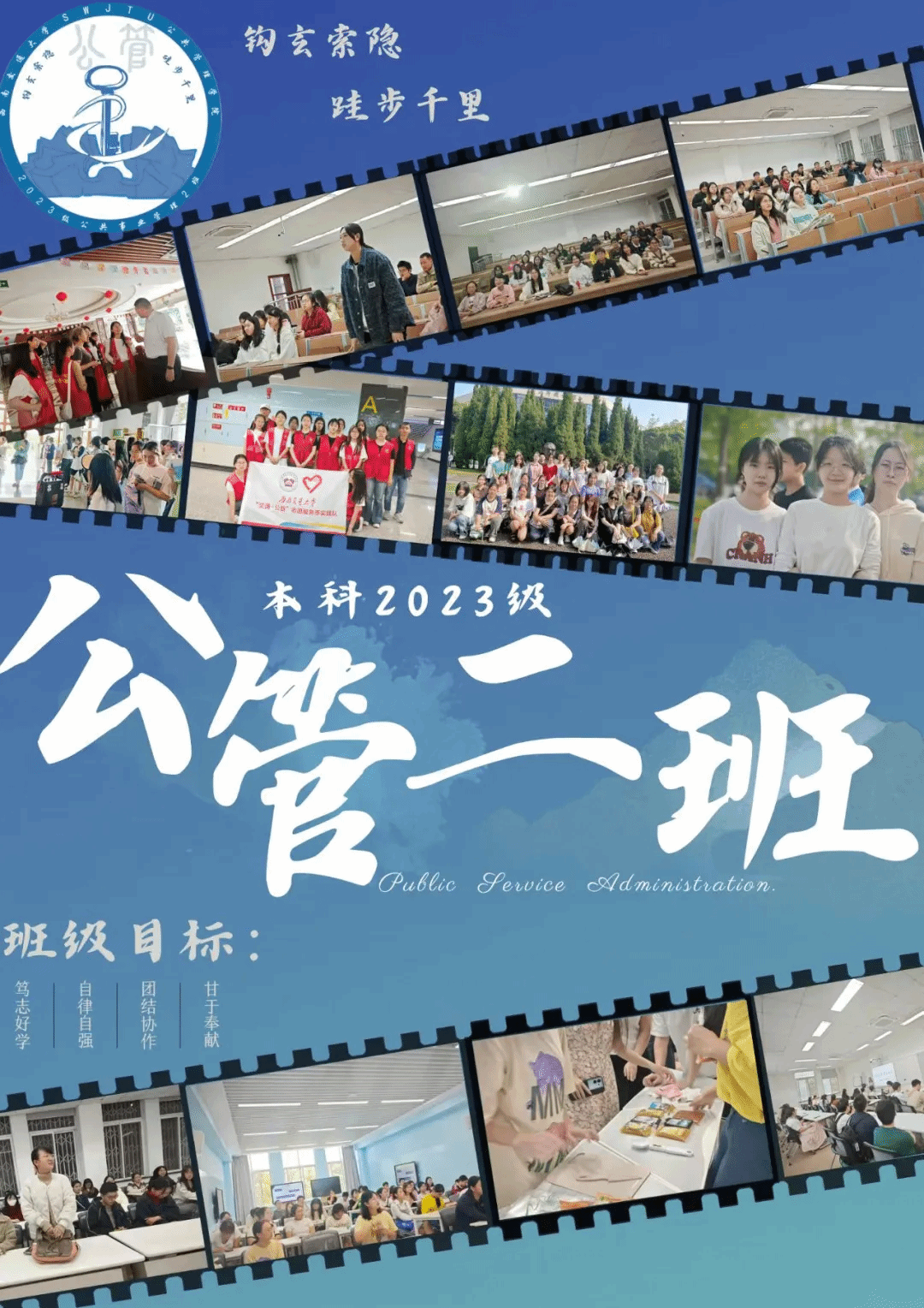 班级介绍:公共2023-01班,是天南海北、五湖四海的奔赴,是盛夏于蓉城的相遇。经此一年,我们走过了夏日骄阳、秋日桂香,冬雾与春暖。经过一年的学习生活与建设,我们以“公管一班,奋勇向前;公心治世,管领非凡”为班训,以“学业求优绩在前,活动积极展新颜;品德高尚责任担,团结友爱暖心田”为班级目标,始终践行着公心向学,管行合一的原则。未来,公管一班的征途,我们一同前行。