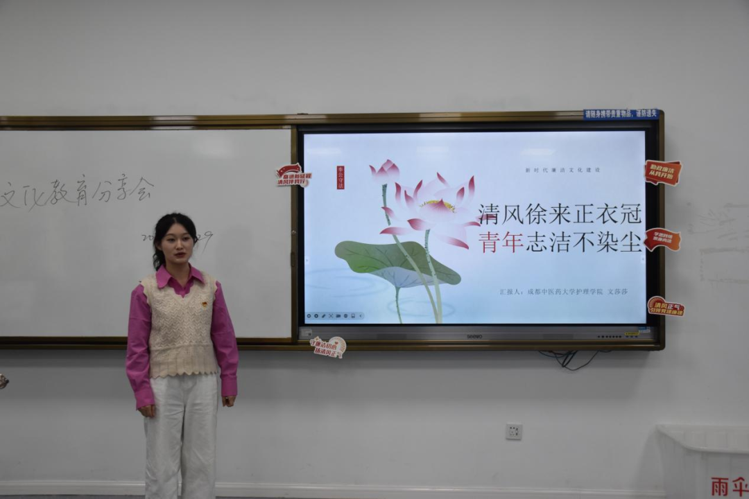 对于新时代廉洁党政工作的理解和作为,学院秉持以“廉”促教、以“廉”育人的工作理念,把加强校园廉洁文化建设作为一体推进“三不腐”的基础性工程和落实立德树人根本任务的重要举措,持续深耕校园廉洁文化建设,打造廉洁文化教育阵地,推动清正廉洁政治底色根植人心;成都中医药大学的学生党员代表文莎莎,则是以案例带领大家深入思考,警示同学们不能犯红线错误,要留清白在人间。并在展示的过程中,抛出问题“青年何以清廉”将廉政建设的种子播撒在每个人的心中;最后是西南财经大学的学生党员代表毛鑫硕,鲜明直接的切入主题,分享了在新时代廉洁文化建设中,西南财经大学党支部的角色定位和具体作为。