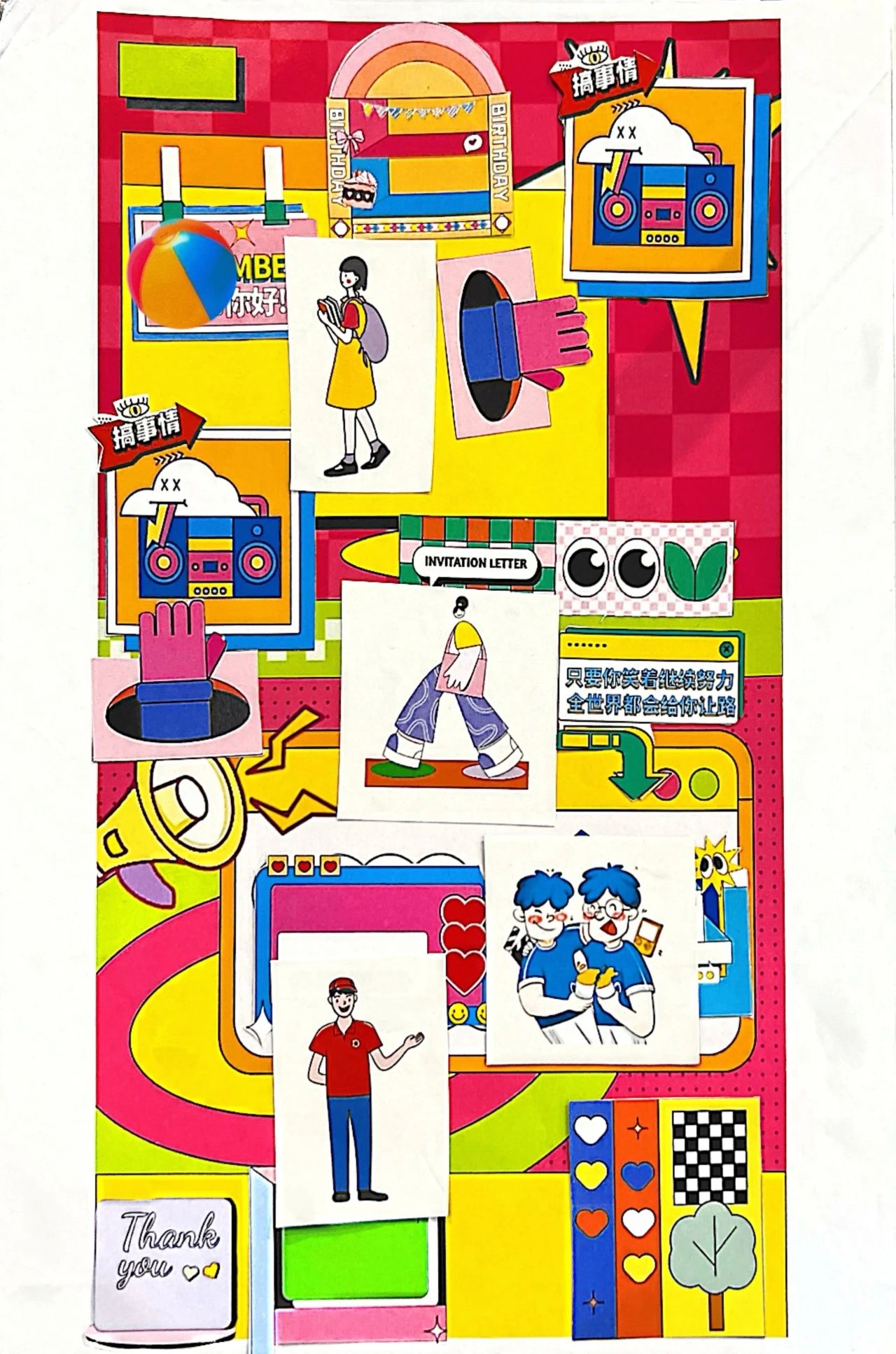 在本活动中,同学们可以用1-3个素材来共同设计拼贴海报,大家在现场充分体会到海报设计的乐趣与不易。现场创意迸发,同学们接龙拼贴自己心仪的素材贴纸,属于记者的创意精神也铭刻于大家心中。下面是本次活动中大家共同完成的海报: