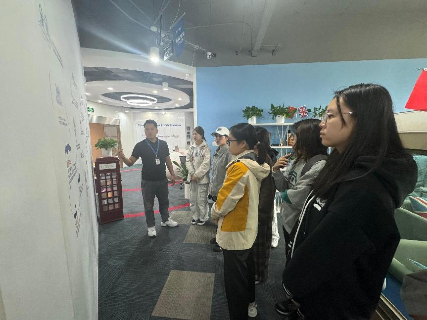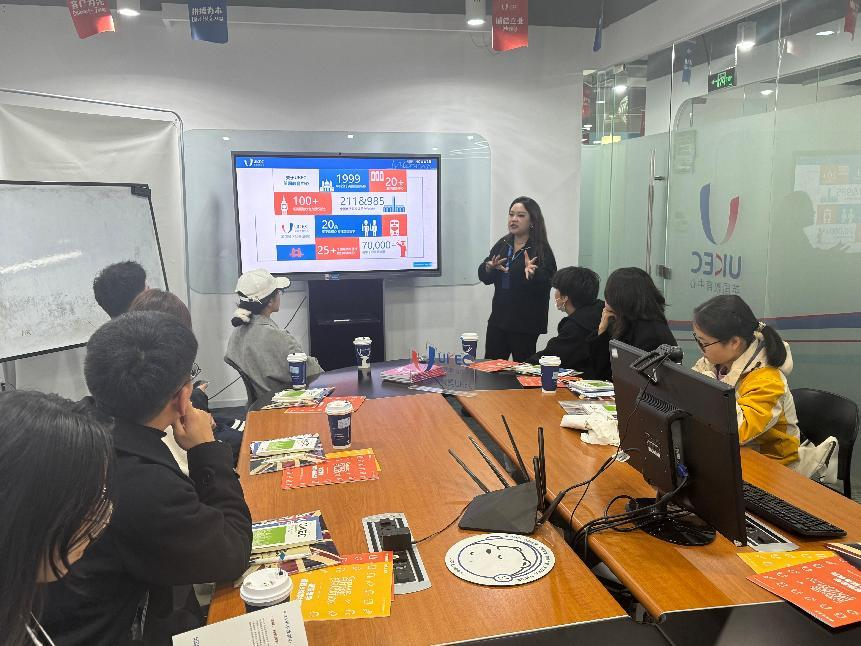 在英国教育中心(UKEC)中国运营中心徐老师和周老师的热情接待下,师生一同参观了企业各办公区域,亲身体验了英国教育中心(UKEC)老师们的工作环境,感受到其积极、融洽的工作氛围。周老师从企业背景、办公环境、91毛巾哥等多个维度,为大家详尽地介绍了UKEC的基本情况、服务优势以及所获得的荣誉,让大家对UKEC有了更全面的认识。